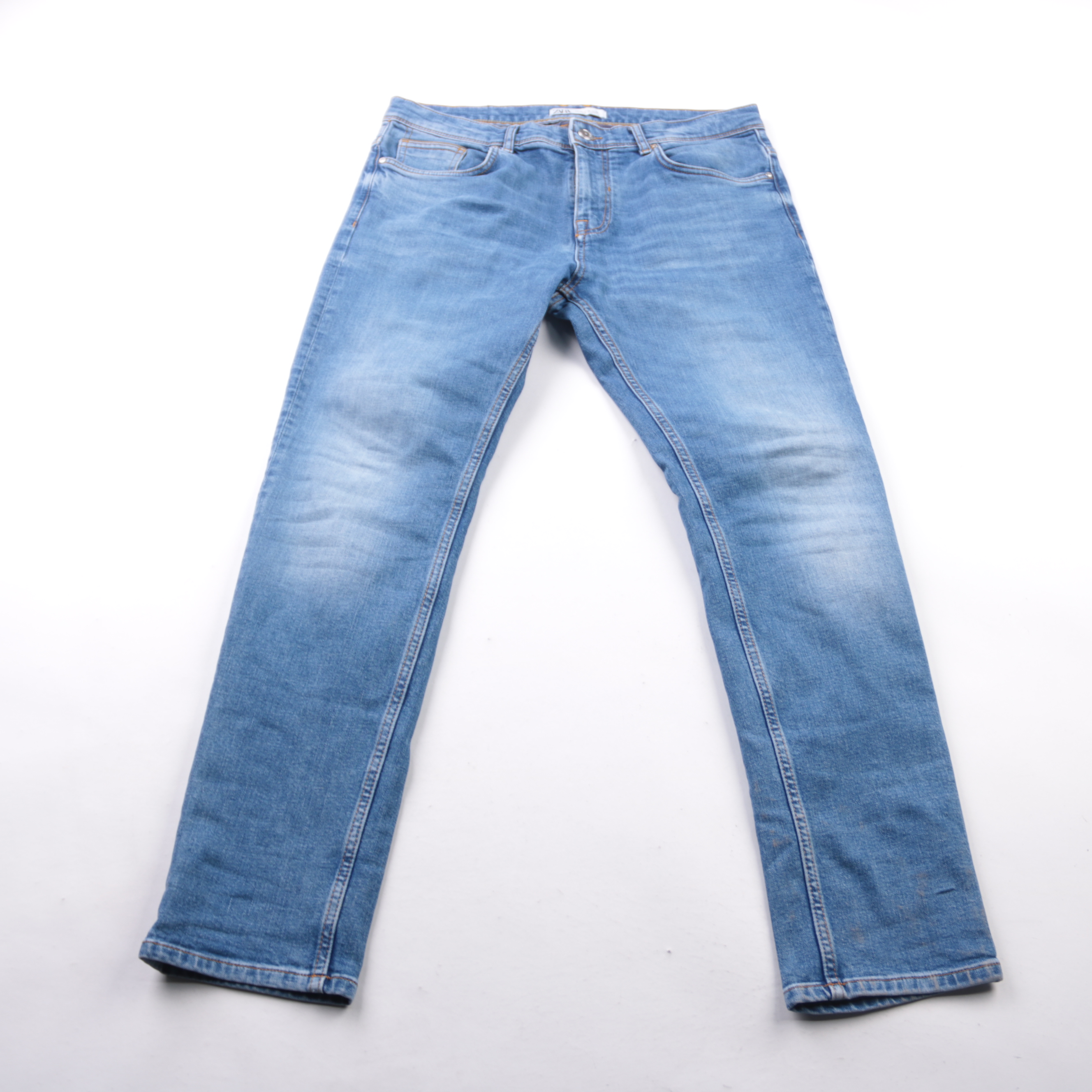 Мужские джинсы Zara из денима светло-голубого цвета с лёгкими высветлениями. Подойдут на каждый день и для casual-образов с футболкой, худи или рубашкой. Практичный плюс — удобная посадка и универсальный цвет, который легко сочетать с любой обувью.
