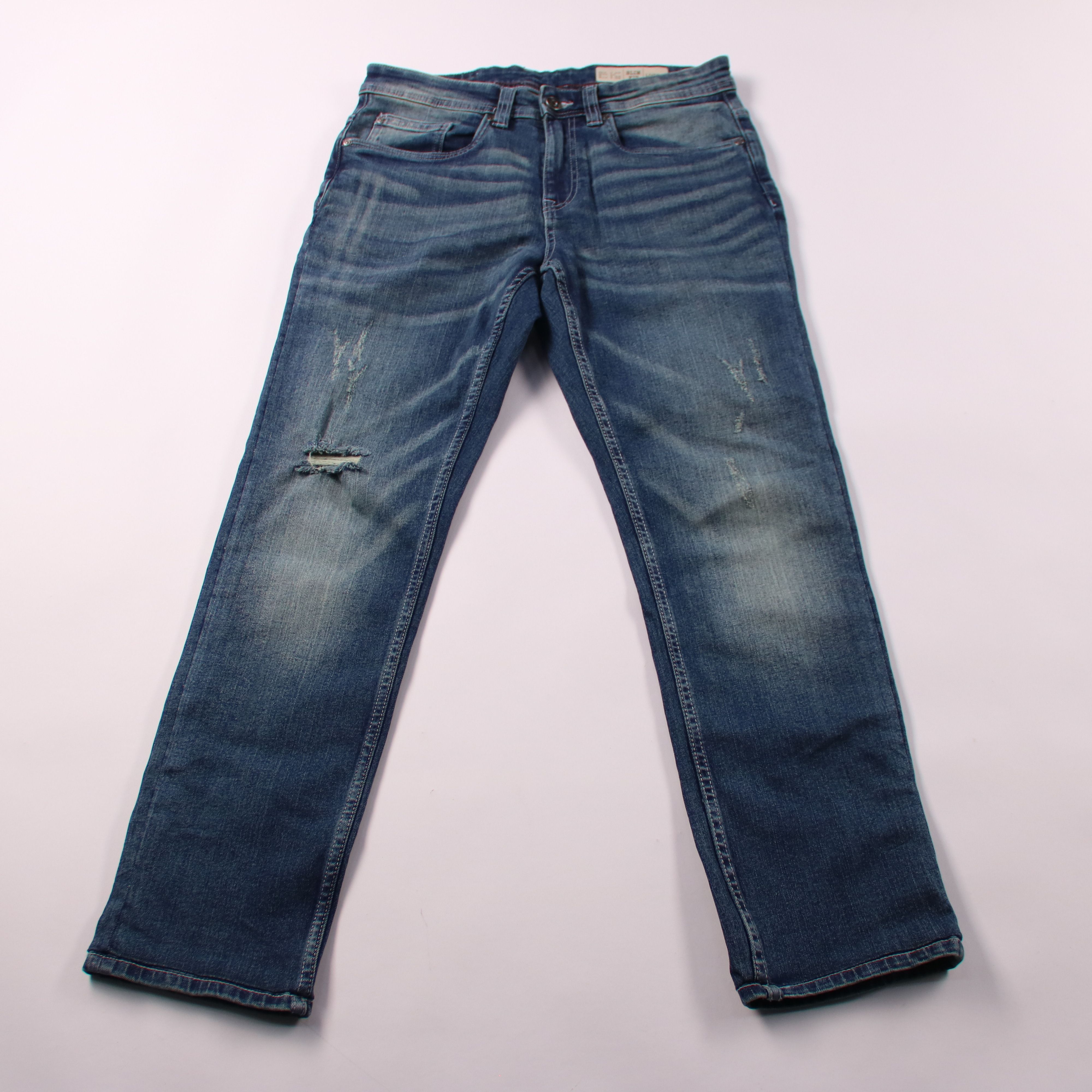Мужские джинсы Livergy Slim Fit из синего денима с легкими потертостями. Подойдут для повседневной носки и городских образов с кедами или ботинками. Практичный плюс — ткань с эластаном лучше садится по фигуре и не сковывает движения.