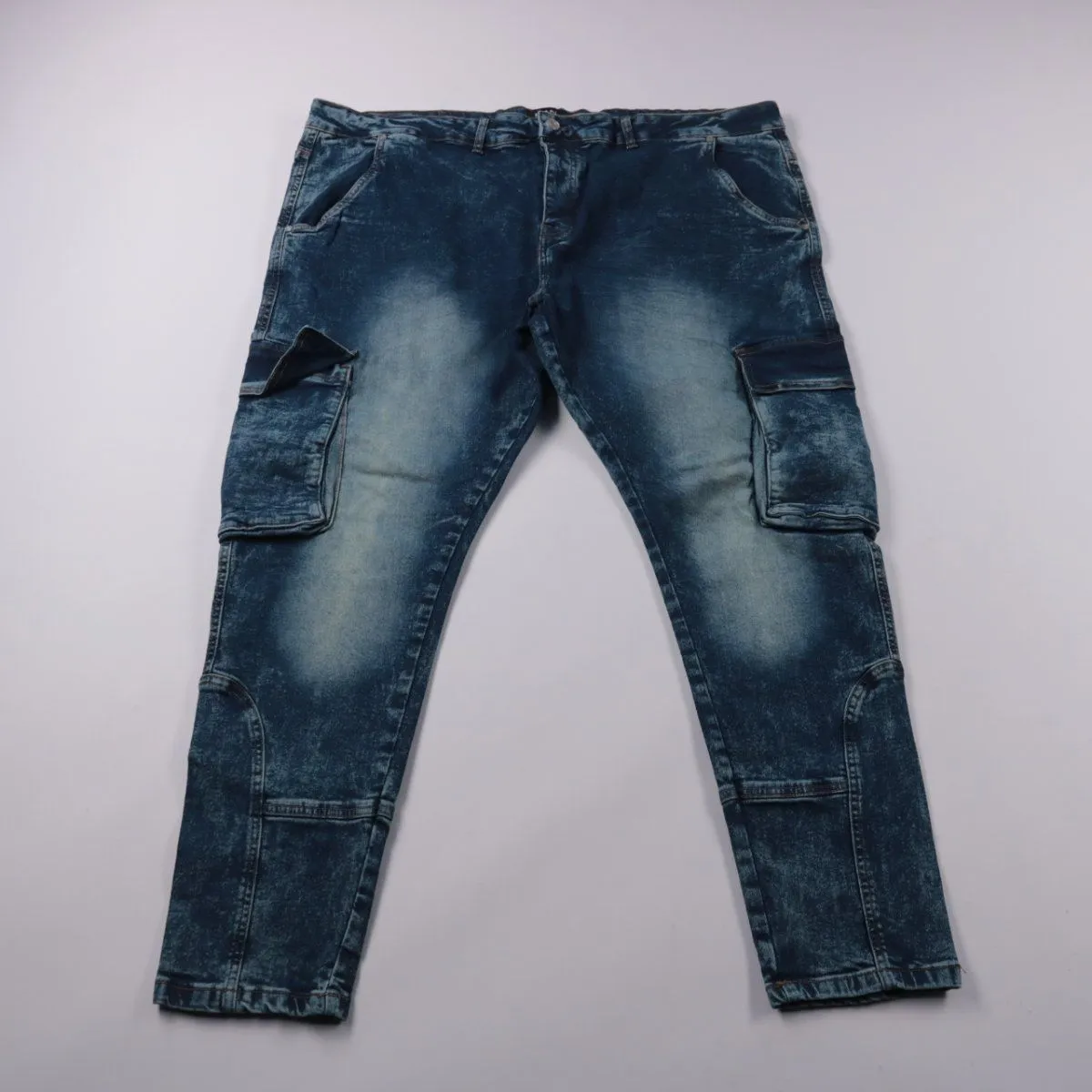 Мужские джинсы BoohooMAN в синем цвете с эффектом потертости и накладными карго-карманами по бокам. Подойдут для повседневной носки и городских образов, когда нужны дополнительные карманы. Плотный деним со стрейчем удобнее садится по фигуре и не сковывает движения.