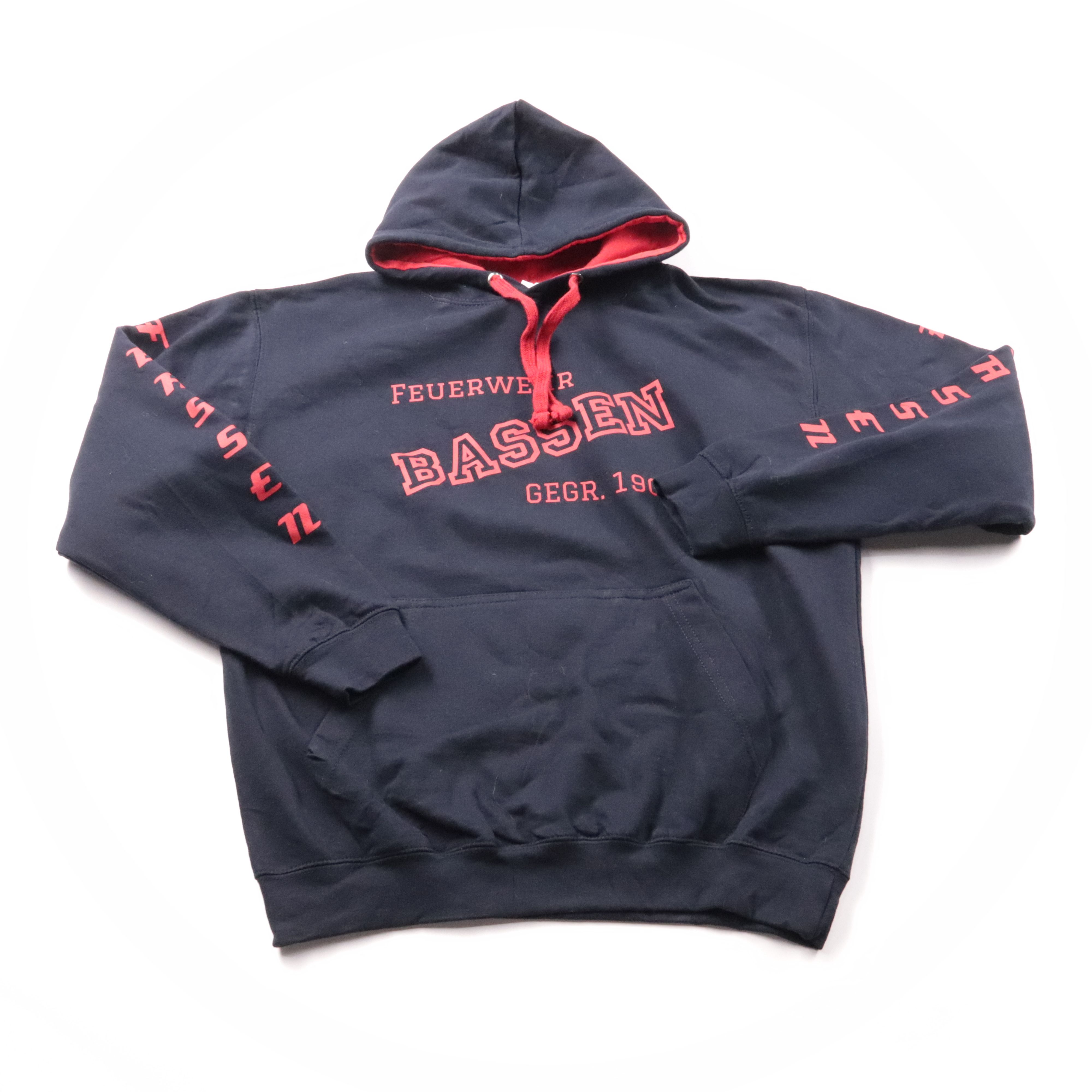 Худи AWDIS в тёмно-синем цвете с красными акцентами и принтом FEUERWEHR BASSEN, с капюшоном и карманом-кенгуру. Подойдёт для повседневной носки и прогулок в прохладную погоду. Практично тем, что плотный материал хорошо держит тепло и не требует сложног...