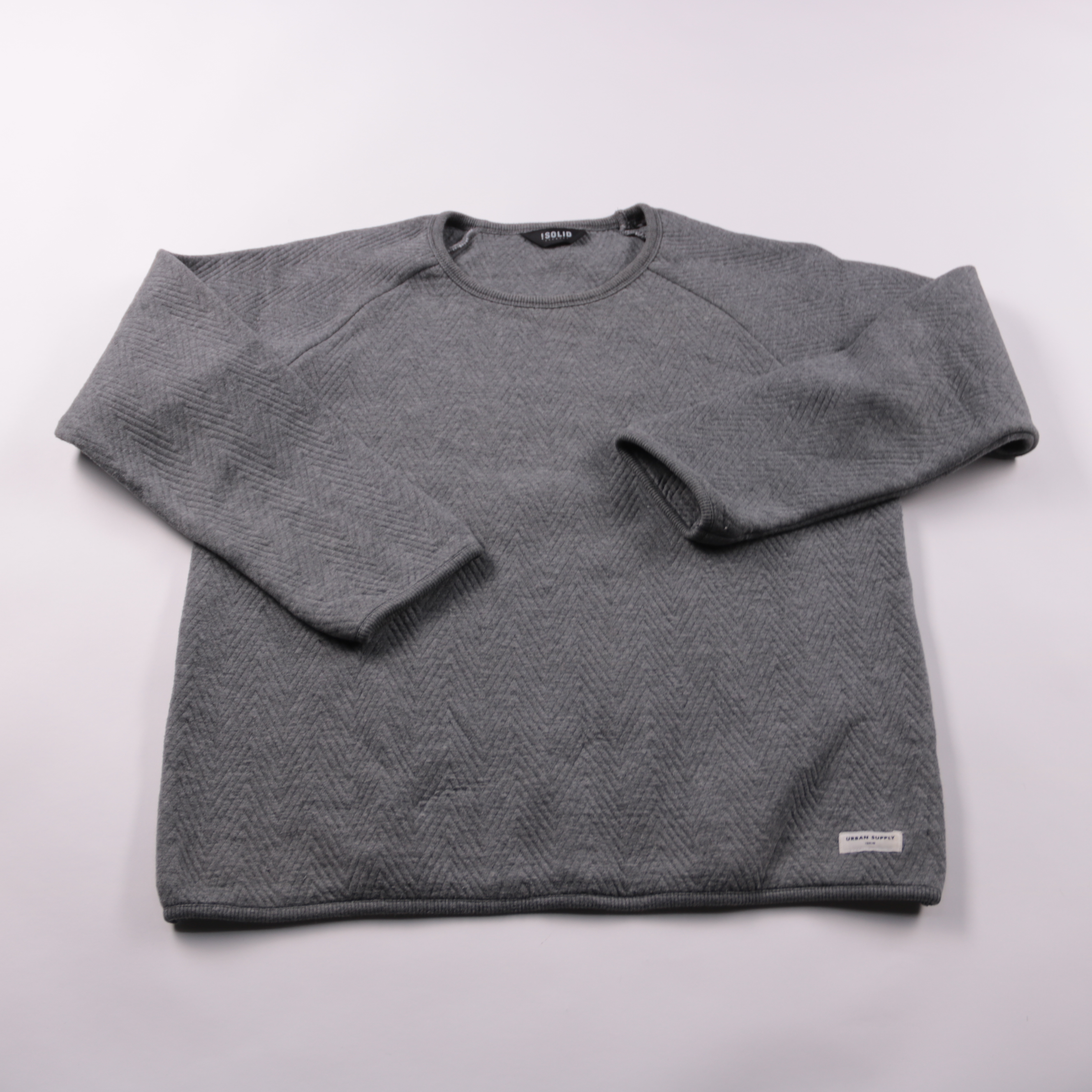 Мужской свитшот Solid серого цвета с фактурным узором «ёлочка» и рукавом реглан. Подойдёт для повседневной носки в городе и офиса в стиле casual, легко сочетается с джинсами и брюками. Практичный плюс — мягкий трикотаж хорошо держит форму и не стесняет...