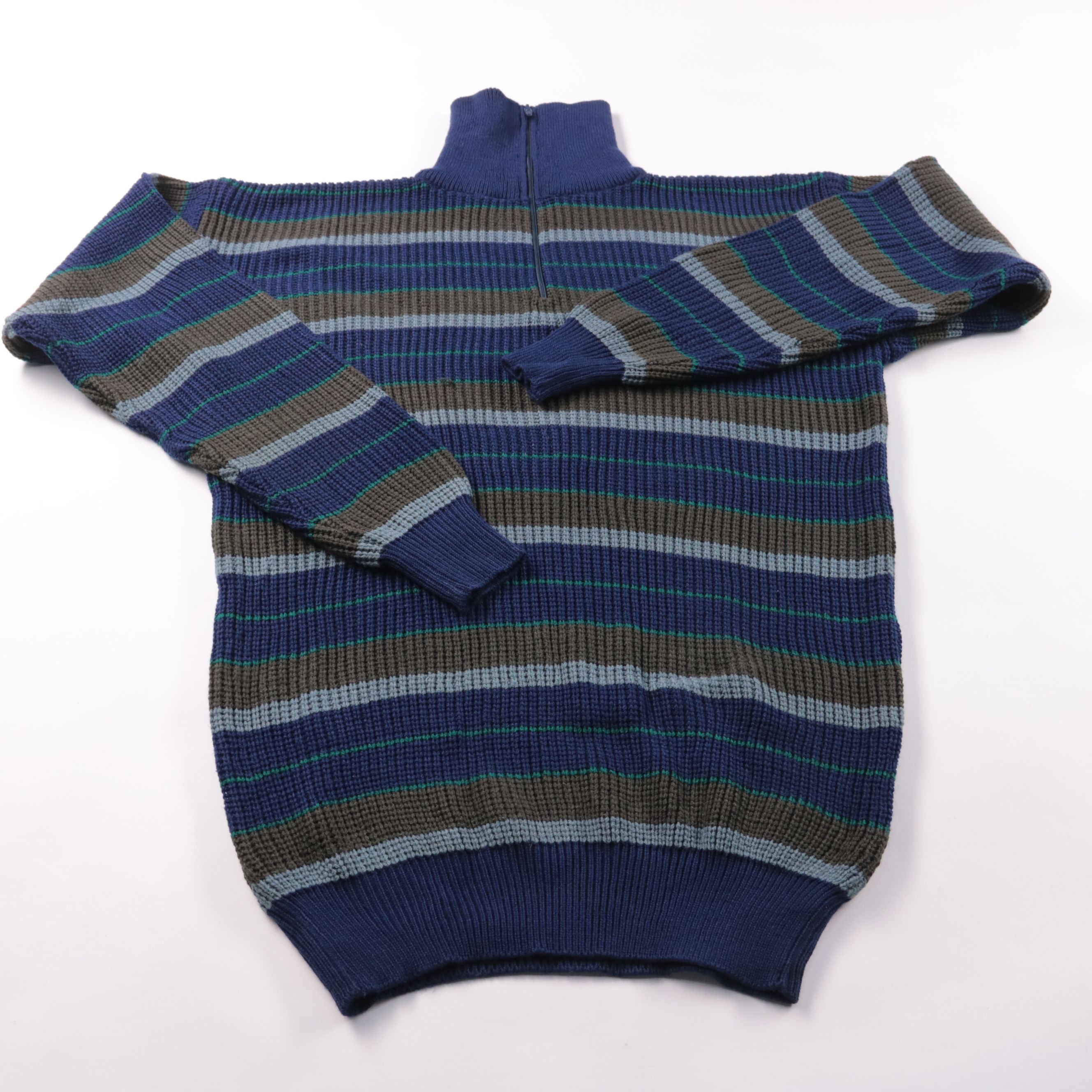 Мужской джемпер в полоску с воротником-стойкой и короткой молнией. Подойдёт для повседневной носки в прохладную погоду, хорошо сочетается с джинсами и чиносами. Практичный акриловый трикотаж прост в уходе и быстро сохнет.