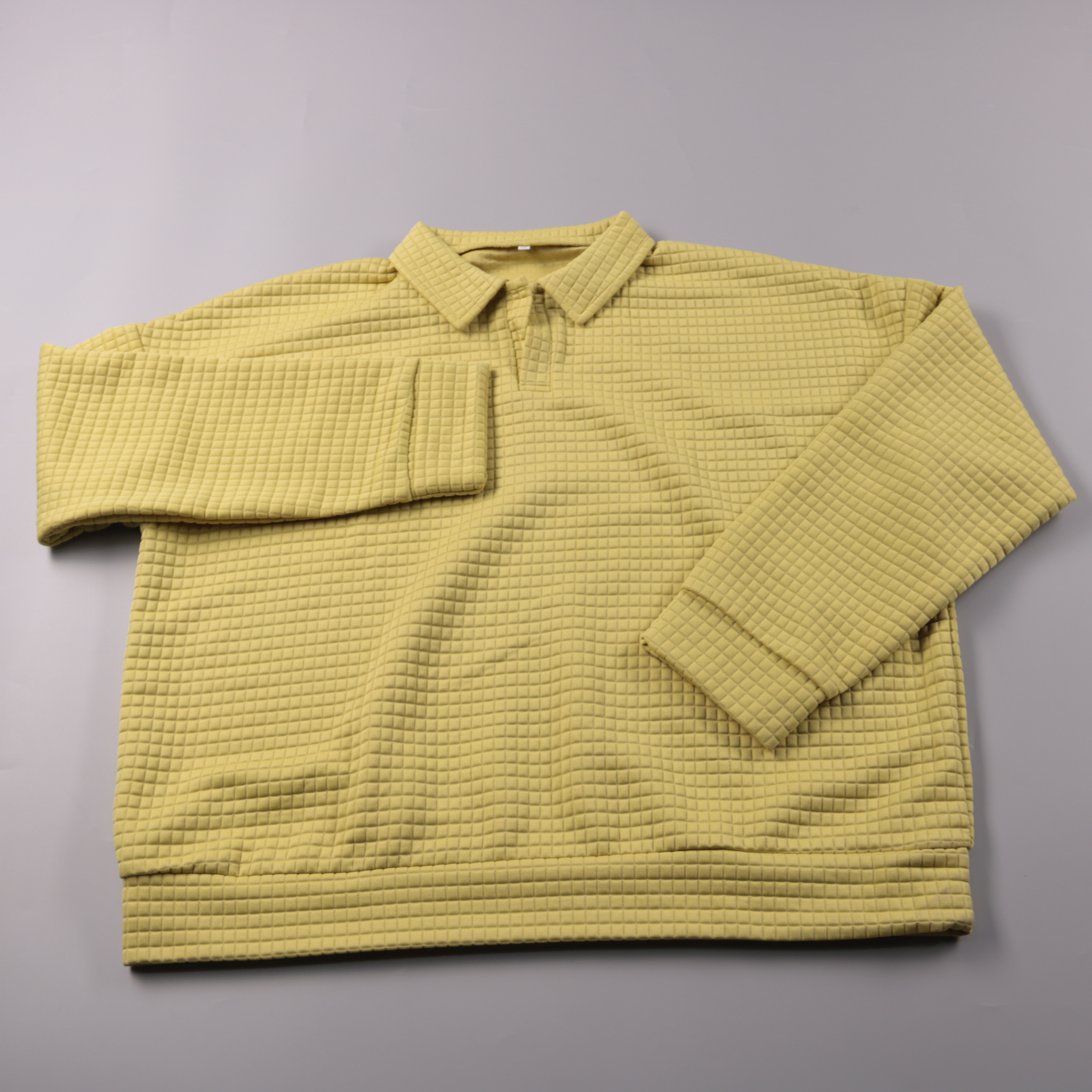 Мужское поло с длинным рукавом из фактурного вафельного трикотажа, без указания бренда. Подойдёт для повседневной носки и образов в стиле casual в межсезонье и прохладным летом. Материал практичный: полиэстер быстро сохнет и меньше мнётся.