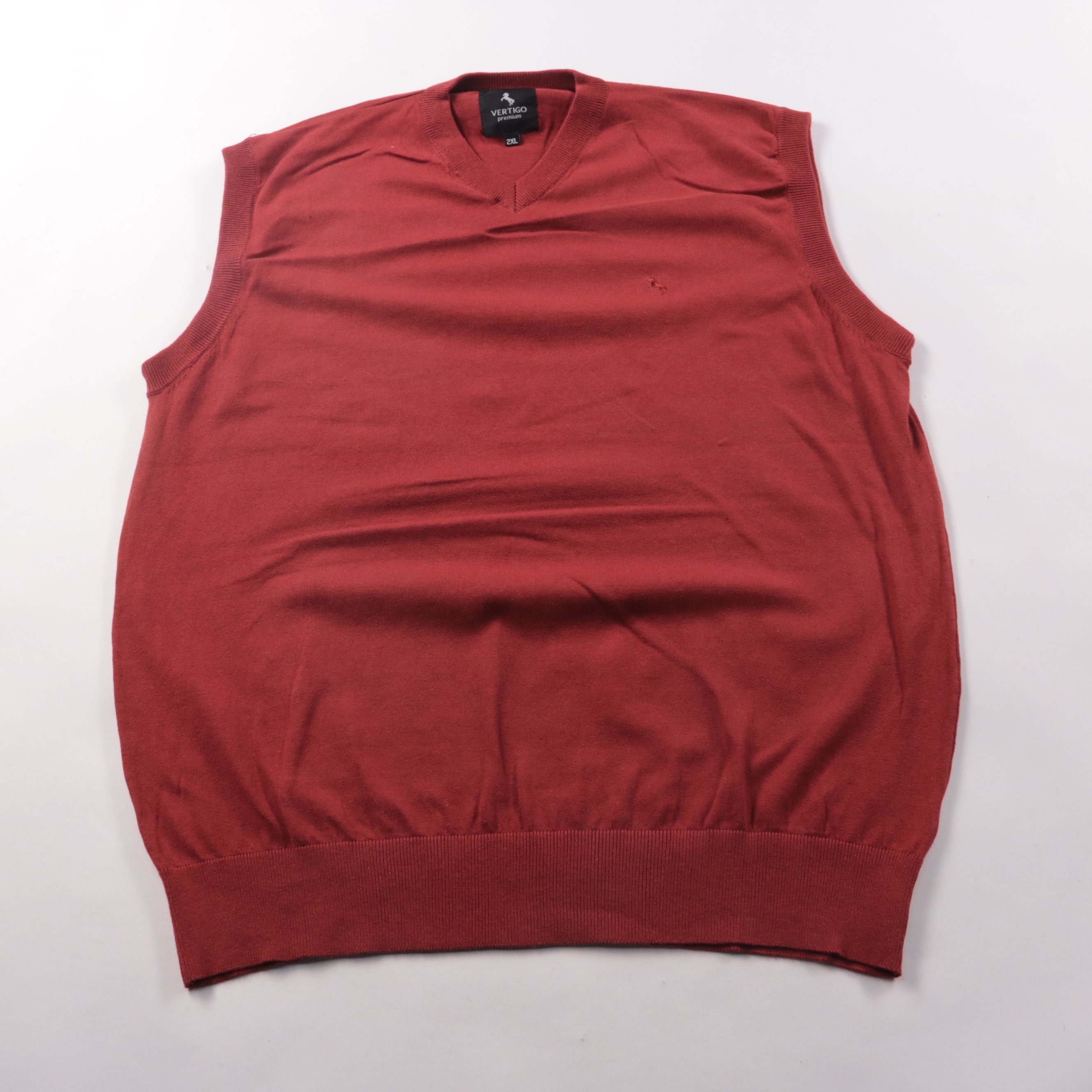 Мужской трикотажный жилет Vertigo Premium бордового цвета с V-образным вырезом. Подойдёт для офиса и повседневных образов поверх рубашки или футболки в прохладную погоду. Хлопковая основа приятна к телу и хорошо дышит.