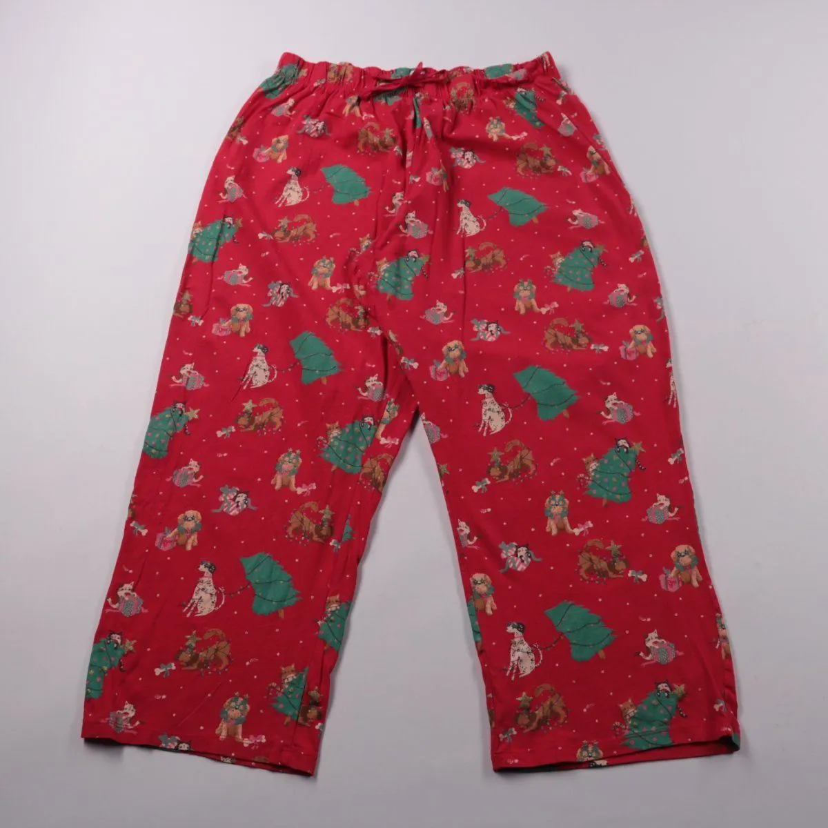 Пижамные штаны F&F из лёгкой ткани красного цвета с новогодним принтом, на резинке и со шнурком на поясе. Подойдут для дома и сна в прохладные вечера. Практичны тем, что хорошо регулируются по талии и не стесняют движения.