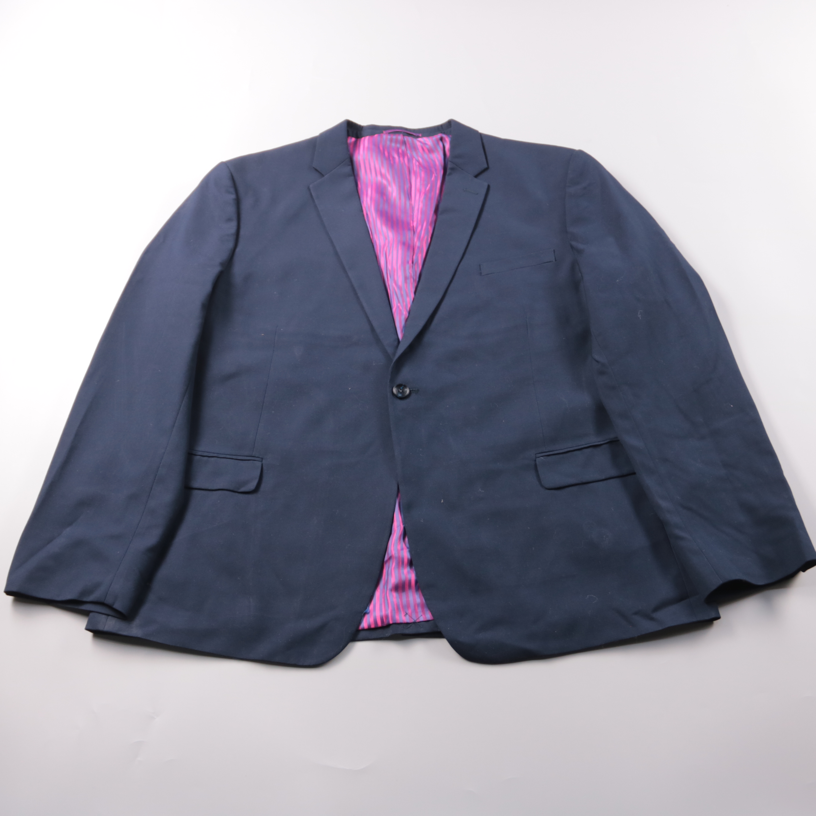 Мужской пиджак Tarocash тёмно-синего цвета с классическими лацканами и застёжкой на одну пуговицу, подкладка в розово-синюю полоску. Подойдёт для офиса, деловых встреч и мероприятий, легко сочетается с рубашками и брюками. Практичный плюс — ткань с пол...