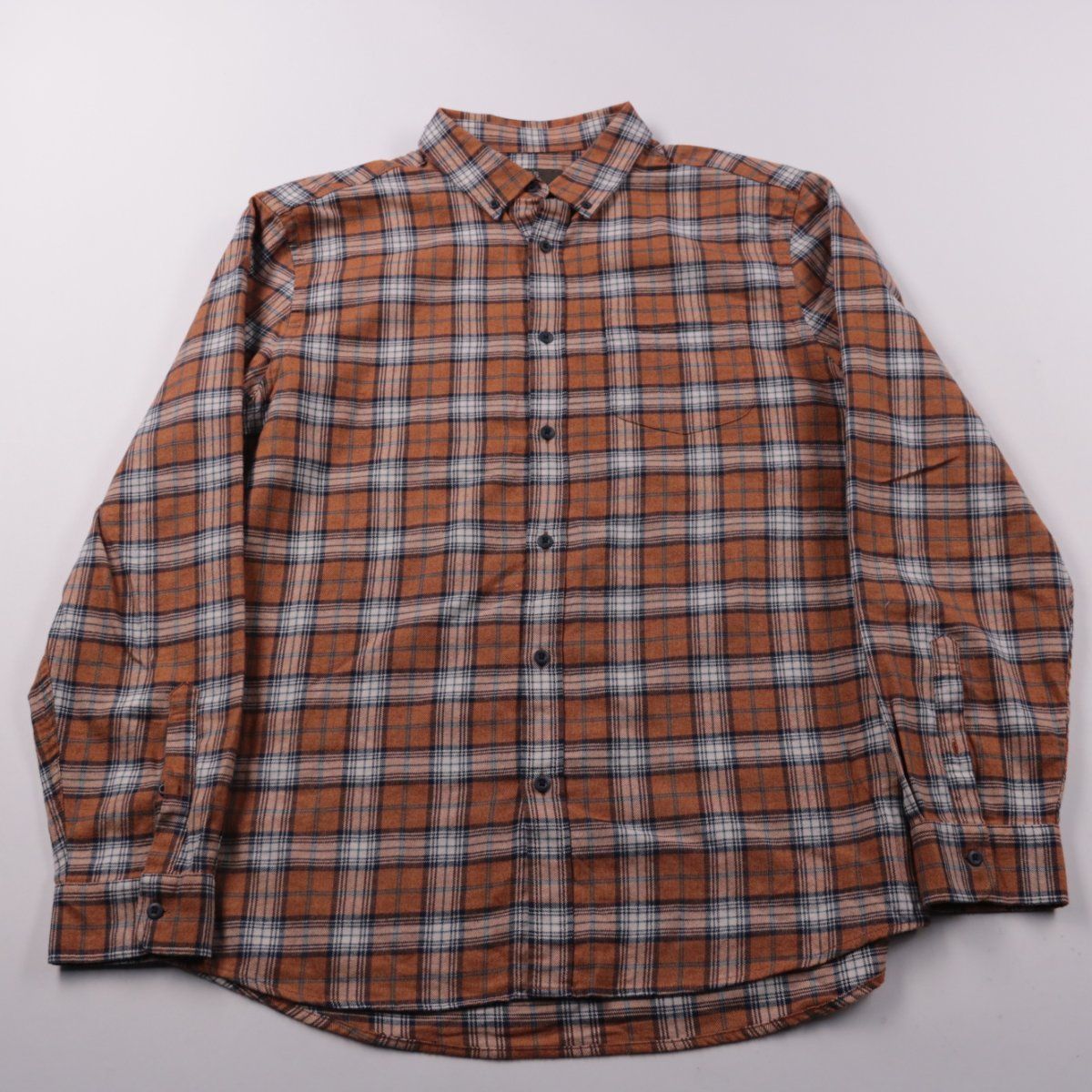 Мужская рубашка M&S в клетку оранжево-сине-белых оттенков, 100% хлопок. Подойдёт для повседневной носки и офиса в стиле casual, можно носить как верхним слоем на футболку. Хлопковая ткань хорошо дышит и комфортна в течение дня.