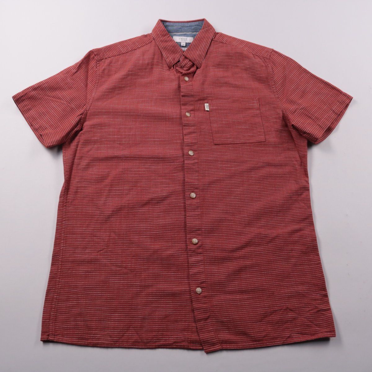 Мужская рубашка Next Regular Fit с коротким рукавом и тонкой полоской. Подойдёт для лета и тёплой погоды, на каждый день или в офис в стиле casual. Практичный плюс — нагрудный карман и удобная застёжка на пуговицы.