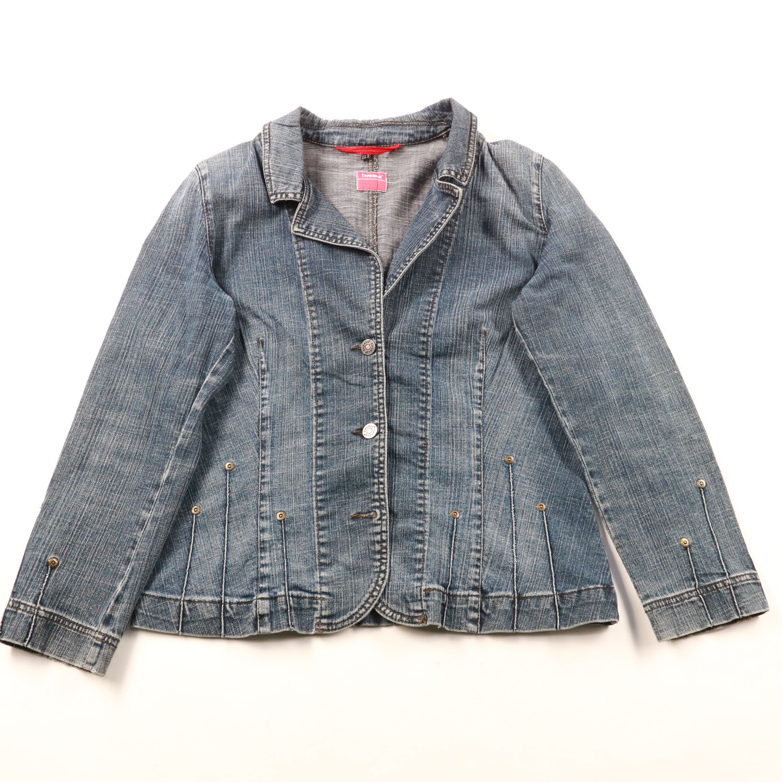 Женская джинсовая куртка Tweans из синего денима, приталенного кроя с воротником и застёжкой на пуговицы. Подойдёт для повседневных образов в межсезонье и прохладным летом, хорошо сочетается с платьями и брюками. Плотный деним держит форму и удобен в н...