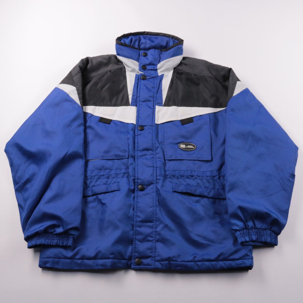 Зимняя куртка AW Works в синем цвете с чёрно-белыми вставками и высоким воротником. Подойдёт для повседневной носки и работы на улице в холодную погоду. Практичный плюс — плотная ткань и удобные карманы на кнопках.