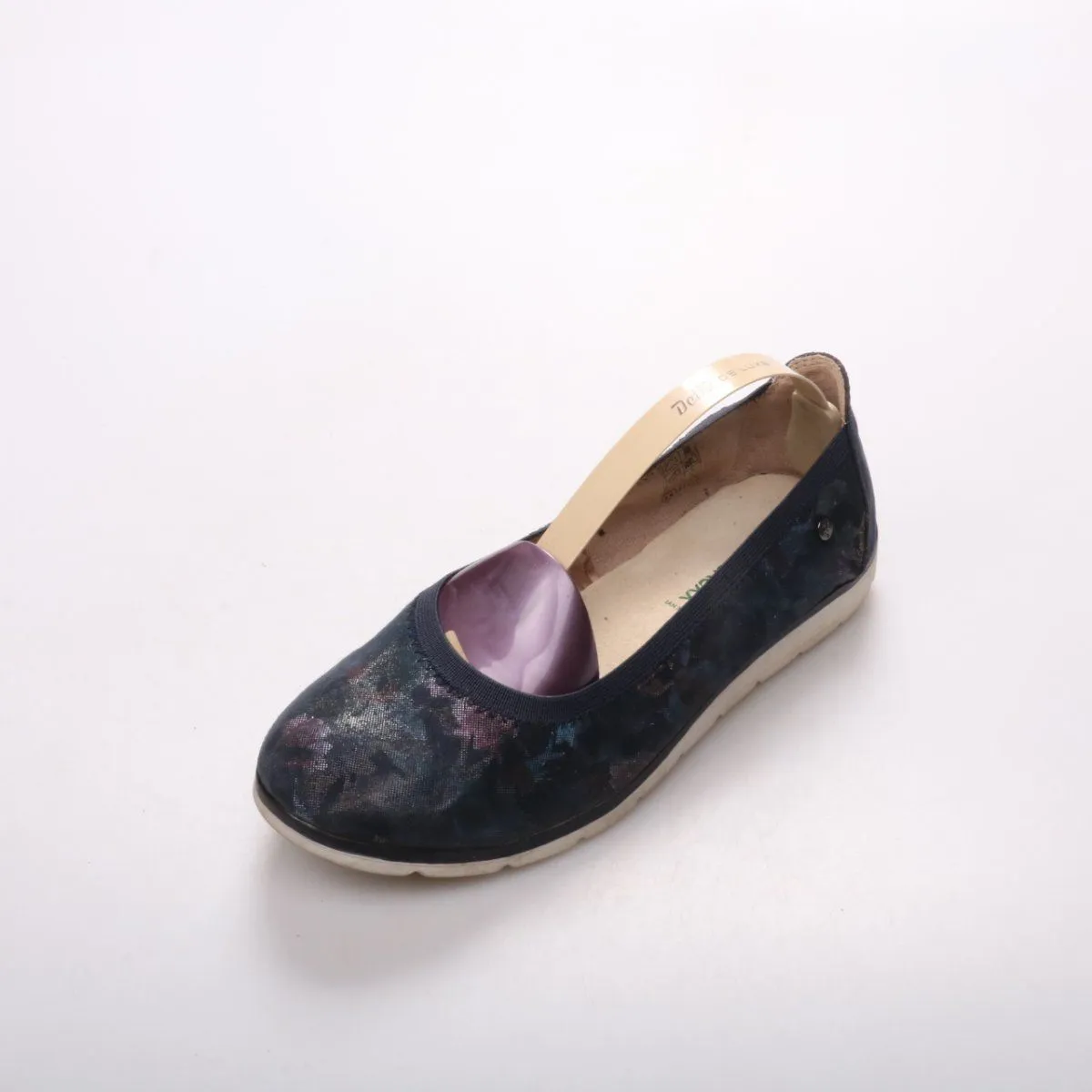 Женские балетки Footflexx тёмно-синего цвета с неброским цветочным принтом и светлой гибкой подошвой. Подойдут для повседневной носки летом и в тёплую погоду, легко сочетаются с платьями и джинсами. Удобная низкая посадка и мягкий верх делают их комфортными для длительных прогулок.