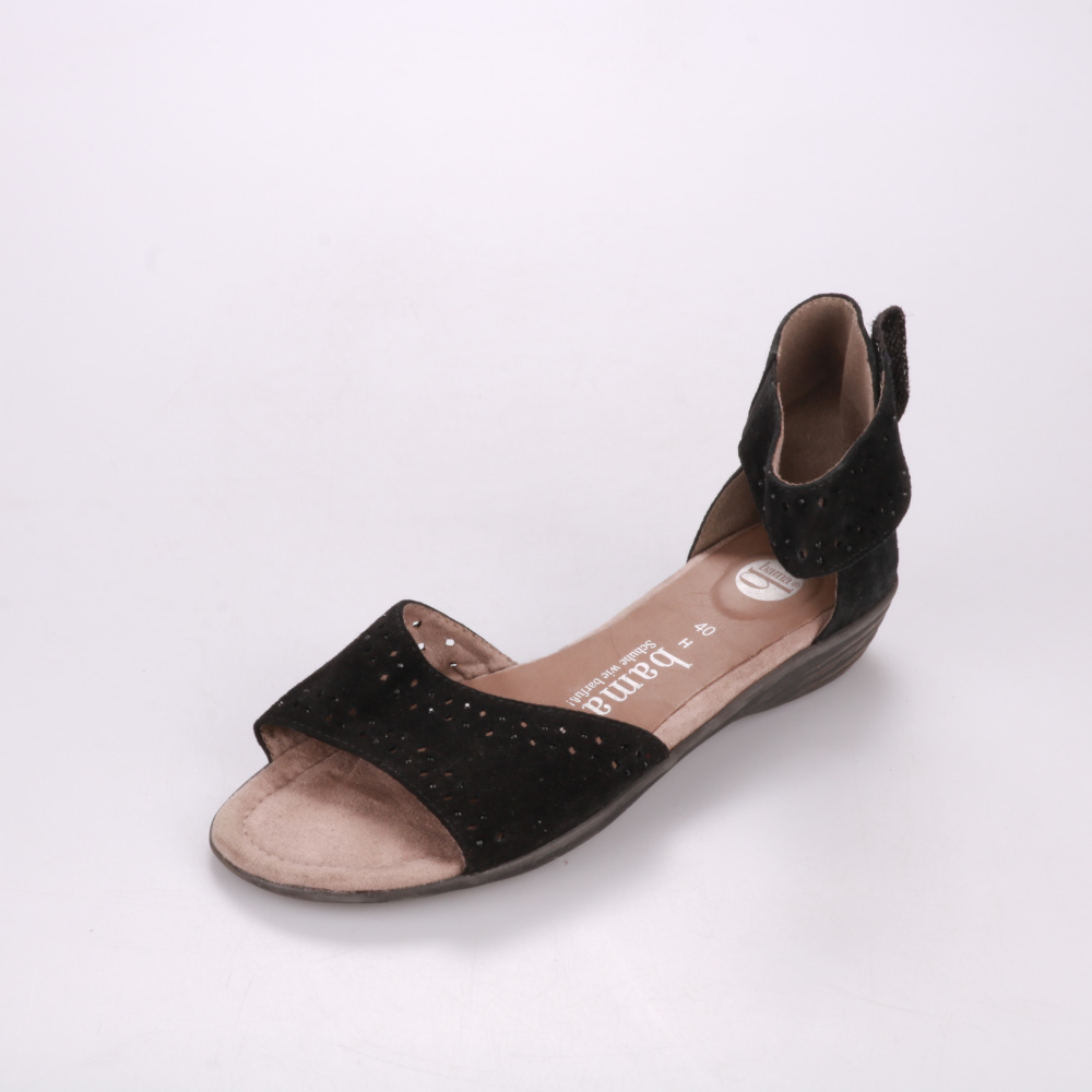 Женские босоножки Bama из чёрной замши/нубука с перфорацией и ремешком на щиколотке. Подойдут для повседневных летних образов и прогулок, когда нужен открытый нос и лёгкая посадка. Удобная низкая танкетка и нескользящая подошва помогают комфортно ходит...