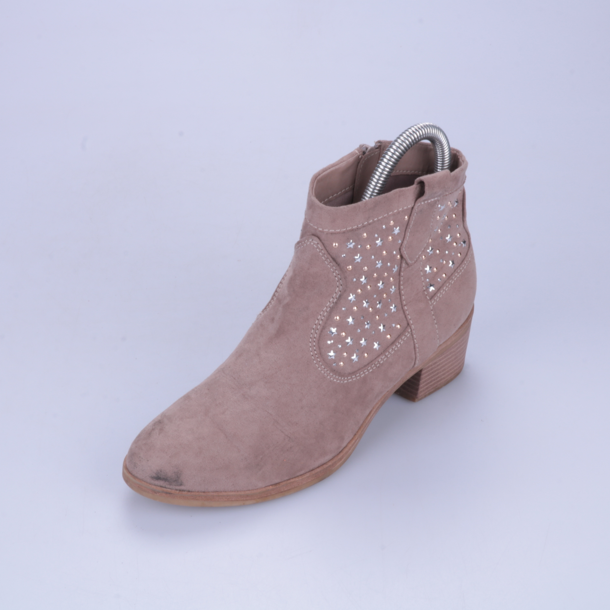 Замшевые ботильоны с боковой молнией и декором из небольших звездочек. Подойдут на каждый день и для прогулок в демисезонную погоду, хорошо смотрятся с джинсами и платьями. Устойчивый невысокий каблук удобен для длительной носки.