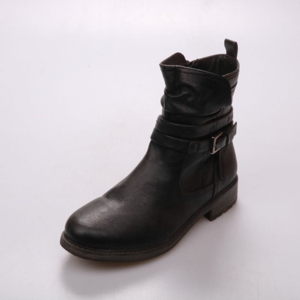 Женские ботинки Easy Street из чёрной кожи с декоративным ремешком и пряжкой. Подойдут на каждый день в прохладную погоду, удобны для города благодаря устойчивому каблуку и молнии сбоку. Рифлёная подошва даёт хорошее сцепление на улице.