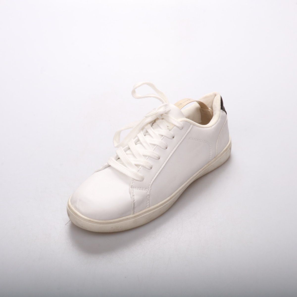 Белые низкие кеды с чёрной вставкой на пятке и шнуровкой. Подойдут для повседневных прогулок и базовых городских образов в любое время года. Практичное преимущество — светлый верх легко сочетается с любой одеждой.