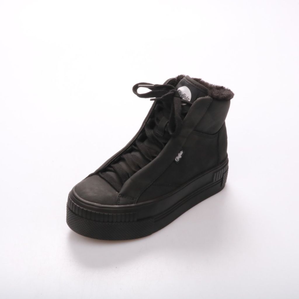Утеплённые высокие кроссовки Buffalo в чёрном цвете с мягкой меховой подкладкой. Подойдут для холодной осени и зимы, хорошо сочетаются с джинсами и пуховиками. Платформенная резиновая подошва более устойчива и лучше защищает от мокрого асфальта.