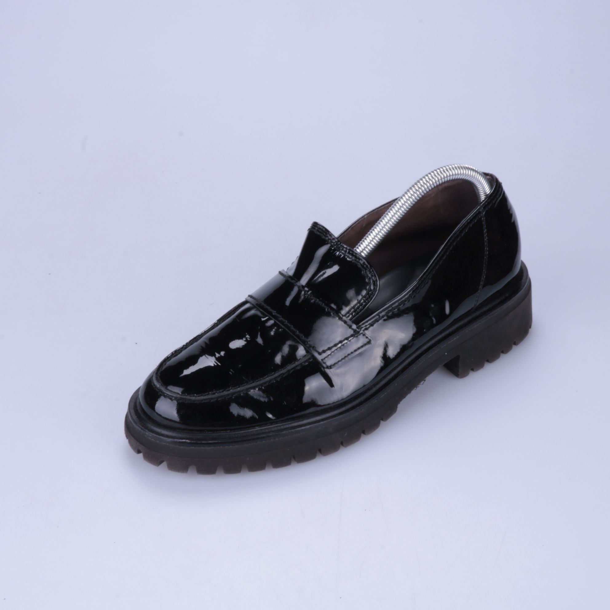 Чёрные лакированные лоферы на массивной тракторной подошве, без шнуровки. Подойдут для повседневных и офисных образов в демисезон. Плотная подошва даёт хорошее сцепление и устойчивость на дороге.