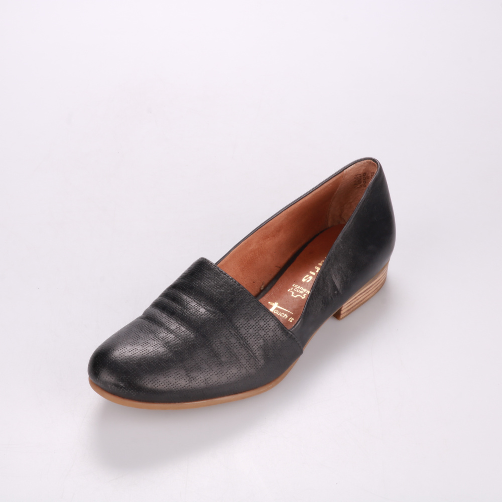 Лоферы Tamaris из чёрной кожи с мягкой посадкой и перфорацией на мысе. Подойдут для офиса и повседневной носки в демисезон, легко сочетаются с брюками и юбками. Невысокий устойчивый каблук делает их удобными на каждый день.