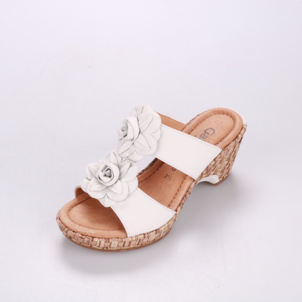 Женские сабо Gabor из белой кожи с объемными цветами на ремешке и плетёной отделкой танкетки. Подойдут для лета и отдыха, хорошо сочетаются с платьями, льняными брюками и джинсами. Удобная колодка и устойчивая танкетка делают их комфортными для долгих ...