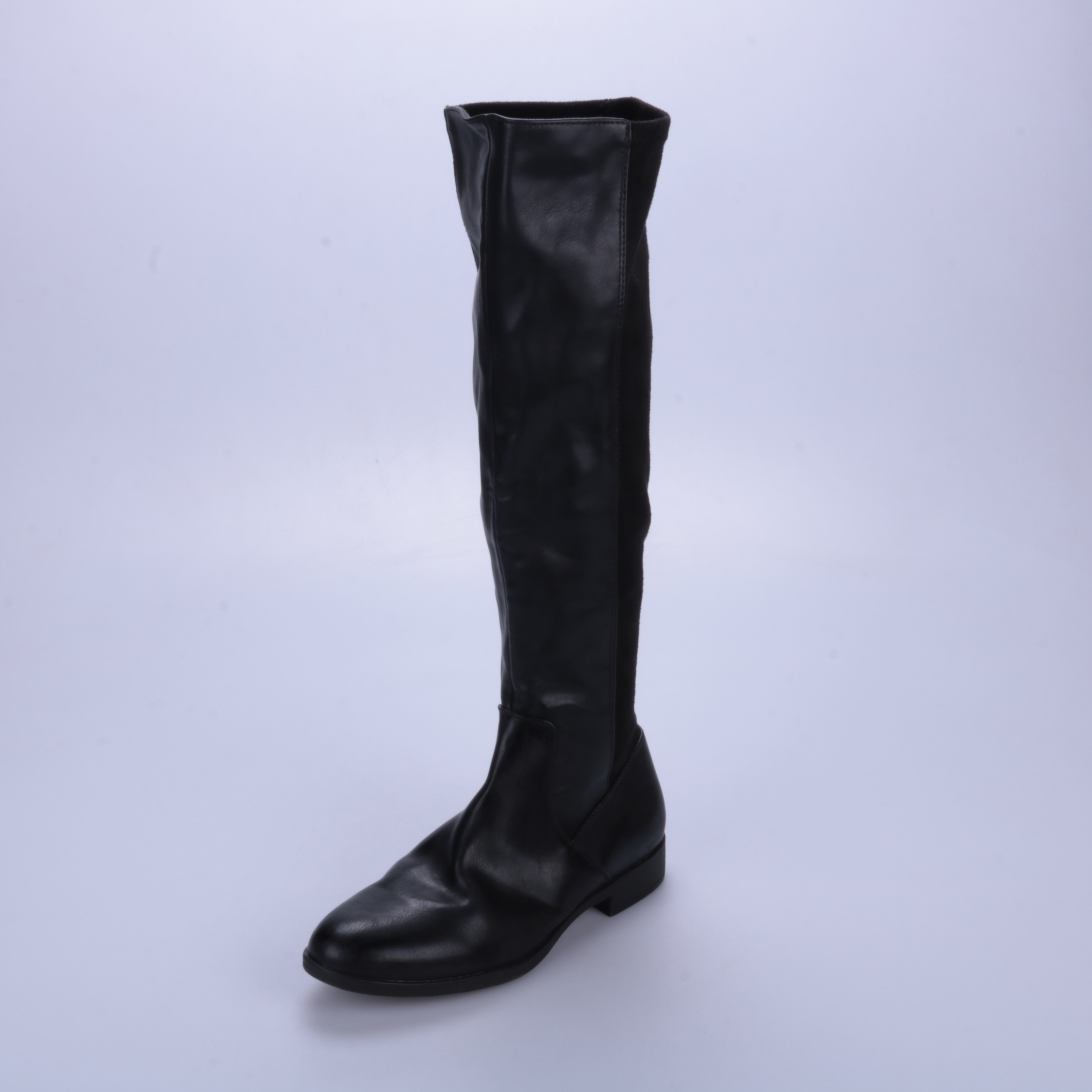 Женские сапоги без указания бренда, чёрного цвета, с высоким голенищем и боковой молнией. Подойдут на каждый день в межсезонье и для городских образов с юбками или узкими брюками. Устойчивый невысокий каблук делает их удобными для длительной ходьбы.