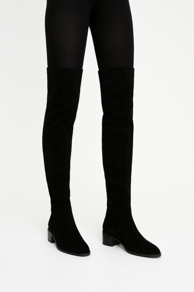 Женские сапоги Stradivarius выше колена из чёрного текстиля (под замшу) с боковой молнией и низким каблуком. Подойдут для повседневных образов в прохладную погоду и легко сочетаются с платьями, юбками и узкими джинсами. Удобная устойчивая подошва делае...