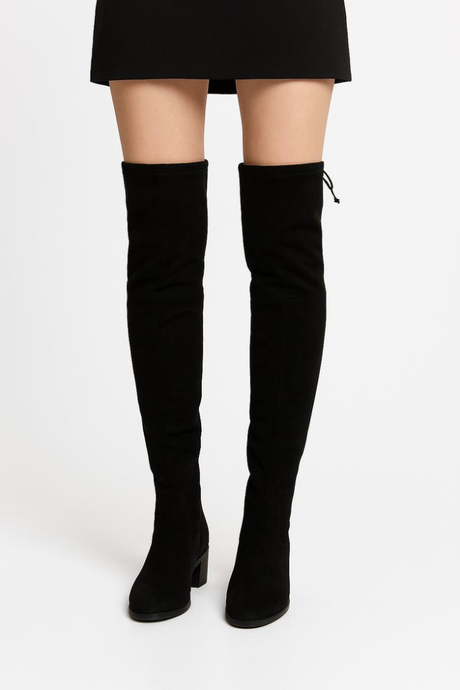Женские сапоги-ботфорты чёрного цвета из мягкого текстильного материала, с утяжкой на кулиске сверху. Подойдут для повседневных образов в прохладную погоду с платьями, юбками и узкими брюками. Устойчивая подошва и невысокий каблук делают их удобными дл...