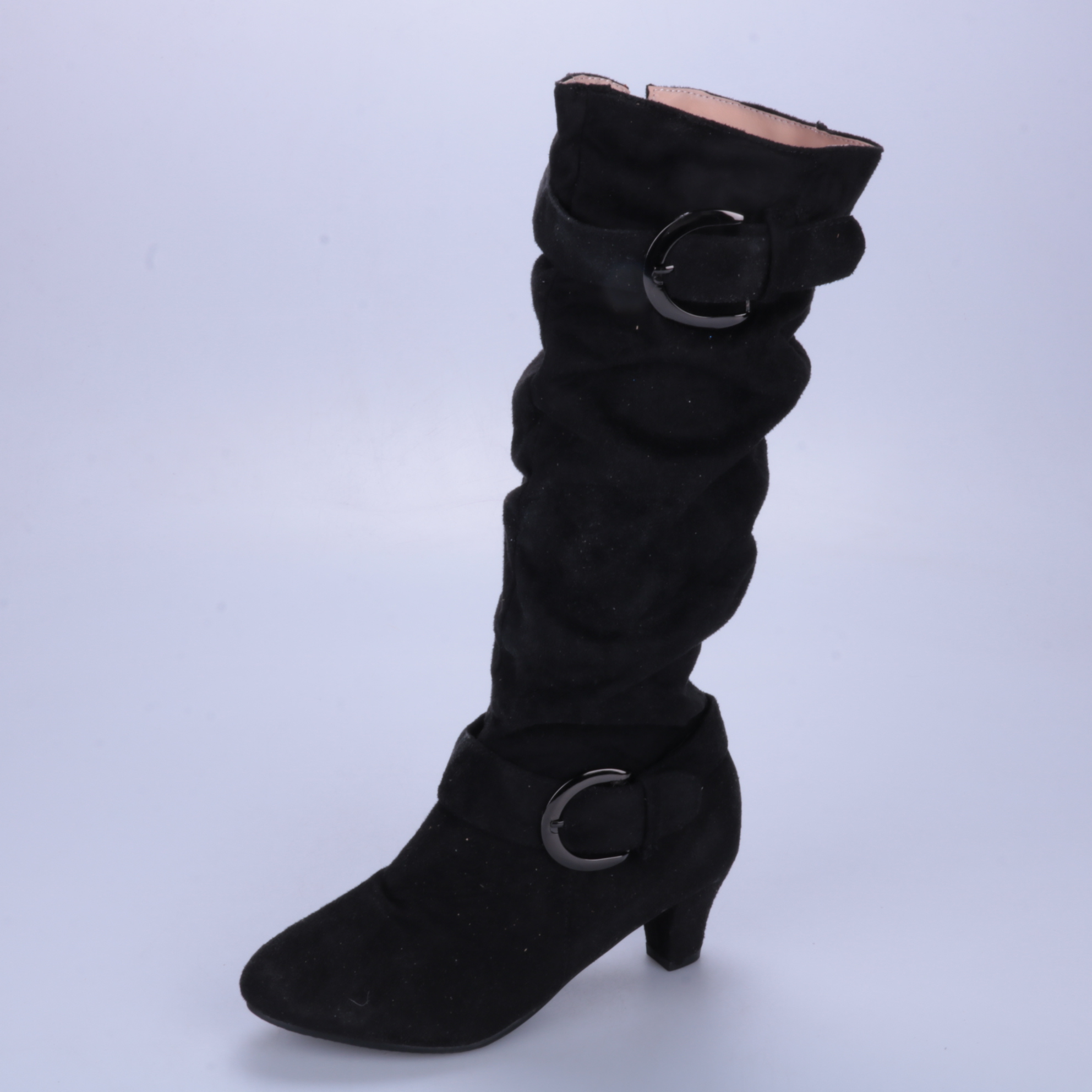 Чёрные замшевые сапоги с мягким присборенным голенищем и декоративными ремешками с пряжками. Подойдут для повседневных образов в межсезонье, хорошо сочетаются с платьями и узкими джинсами. Устойчивый каблук делает модель удобной для длительной носки.