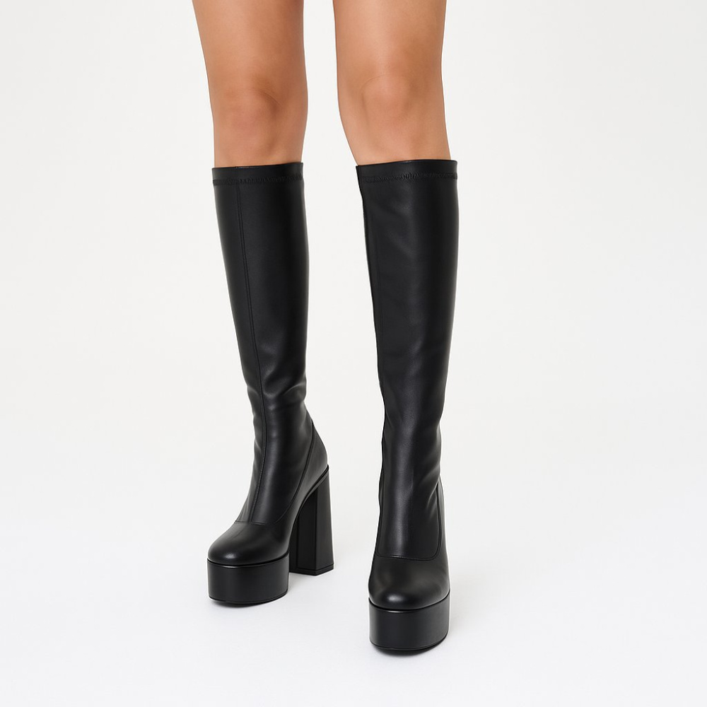 Женские сапоги на высокой платформе и устойчивом каблуке, без бренда на вид. Подойдут для прогулок и вечерних образов в прохладную погоду, хорошо сочетаются с платьями и юбками. Платформа снижает ощущаемую высоту каблука и делает шаг более устойчивым.