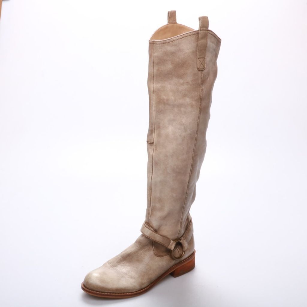 Кожаные сапоги без указания бренда, высокая голенище и ремешок с пряжкой у щиколотки. Подойдут для повседневной носки в межсезонье с джинсами, платьями и юбками. Практичное преимущество — устойчивый низкий каблук и удобные петли для надевания.