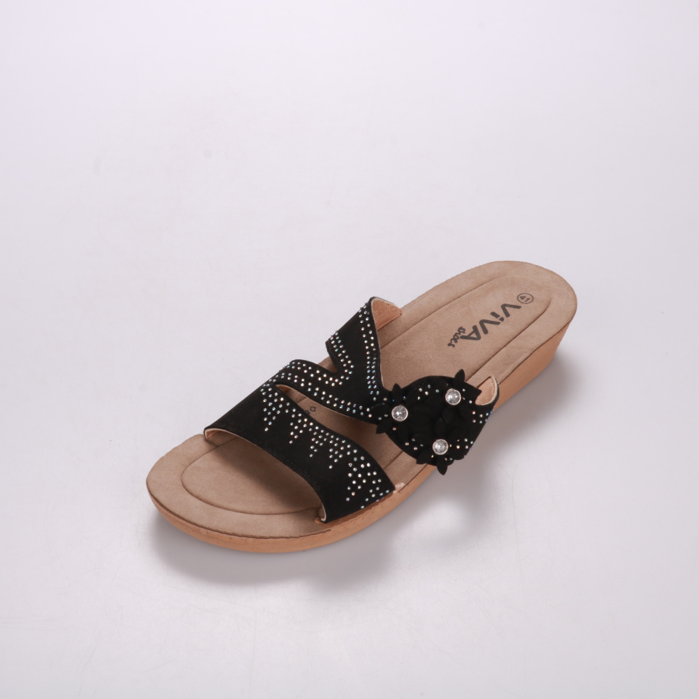 Шлёпанцы Viva в чёрном цвете с декором из страз и цветком, на удобной небольшой платформе. Подойдут для лета, отпуска и повседневных прогулок, легко сочетаются с платьями и шортами. Рельефная подошва снижает скольжение и делает ходьбу устойчивее.