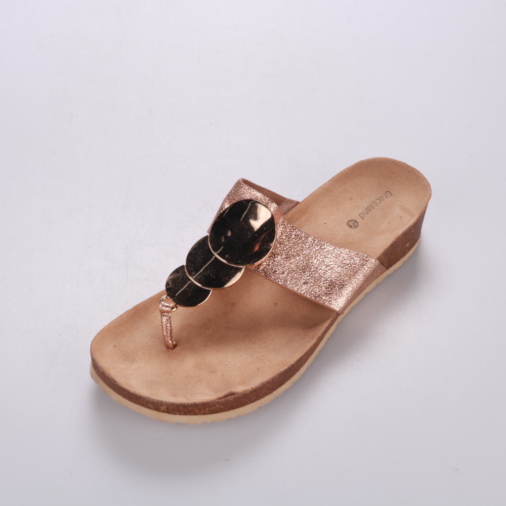 Шлёпанцы Graceland с блестящим верхом и декоративными металлическими вставками. Подойдут для лета и отдыха, легко сочетаются с платьями и шортами. Удобная пробковая подошва хорошо амортизирует при ходьбе.