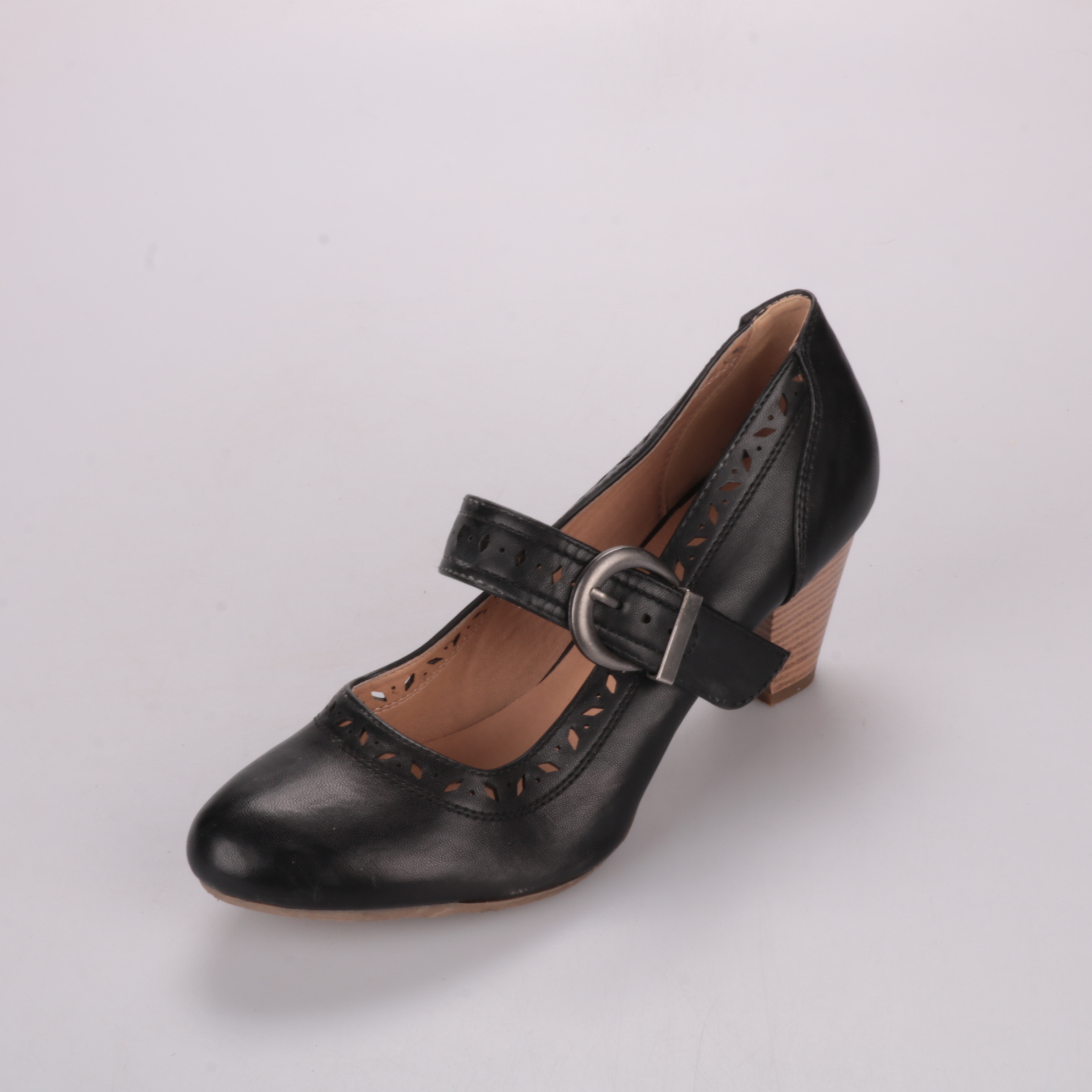 Женские туфли Pummys из чёрной гладкой кожи с перфорацией и ремешком с пряжкой (модель Mary Jane) на устойчивом каблуке. Подойдут для офиса и повседневных образов в демисезон. Практичный плюс — ремешок фиксирует стопу, а каблук удобен для ходьбы.