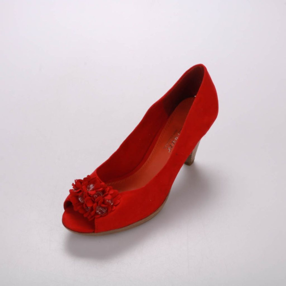 Женские туфли Marco Tozzi ярко-красного цвета с открытым носком и декоративным цветком спереди. Подойдут для летних прогулок и мероприятий, когда хочется сделать акцент в образе. Устойчивый каблук средней высоты удобен для носки в течение дня.
