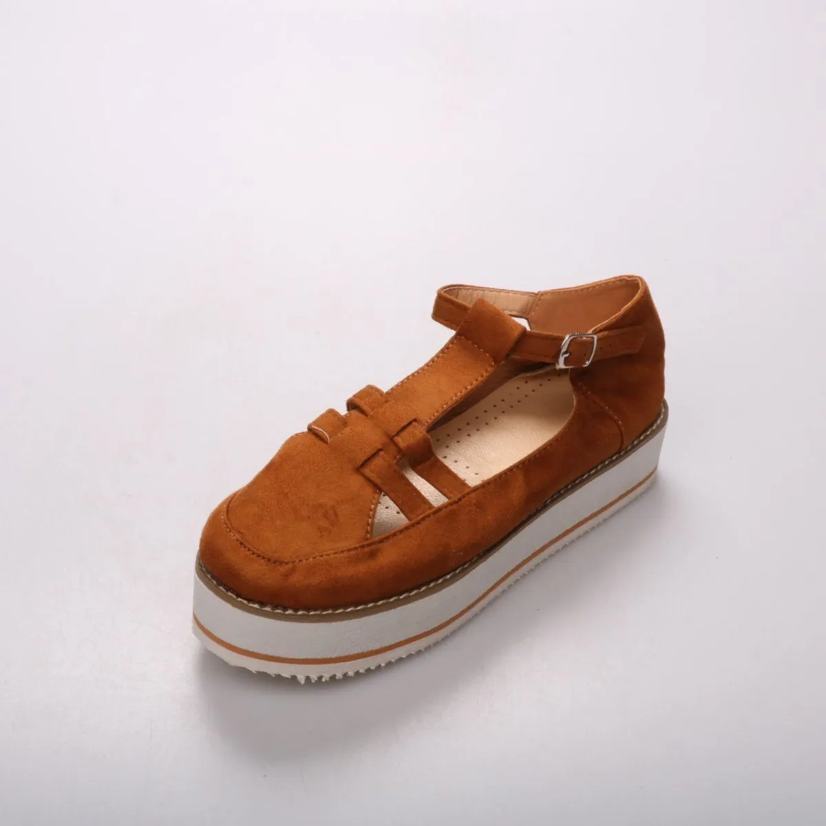 Женские туфли без бренда из замши рыжего цвета на высокой платформе, с открытыми боковыми вставками и ремешком на пряжке. Подойдут для тёплой погоды и городских прогулок, хорошо сочетаются с платьями и джинсами. Платформа добавляет рост и при этом даёт устойчивую опору при ходьбе.