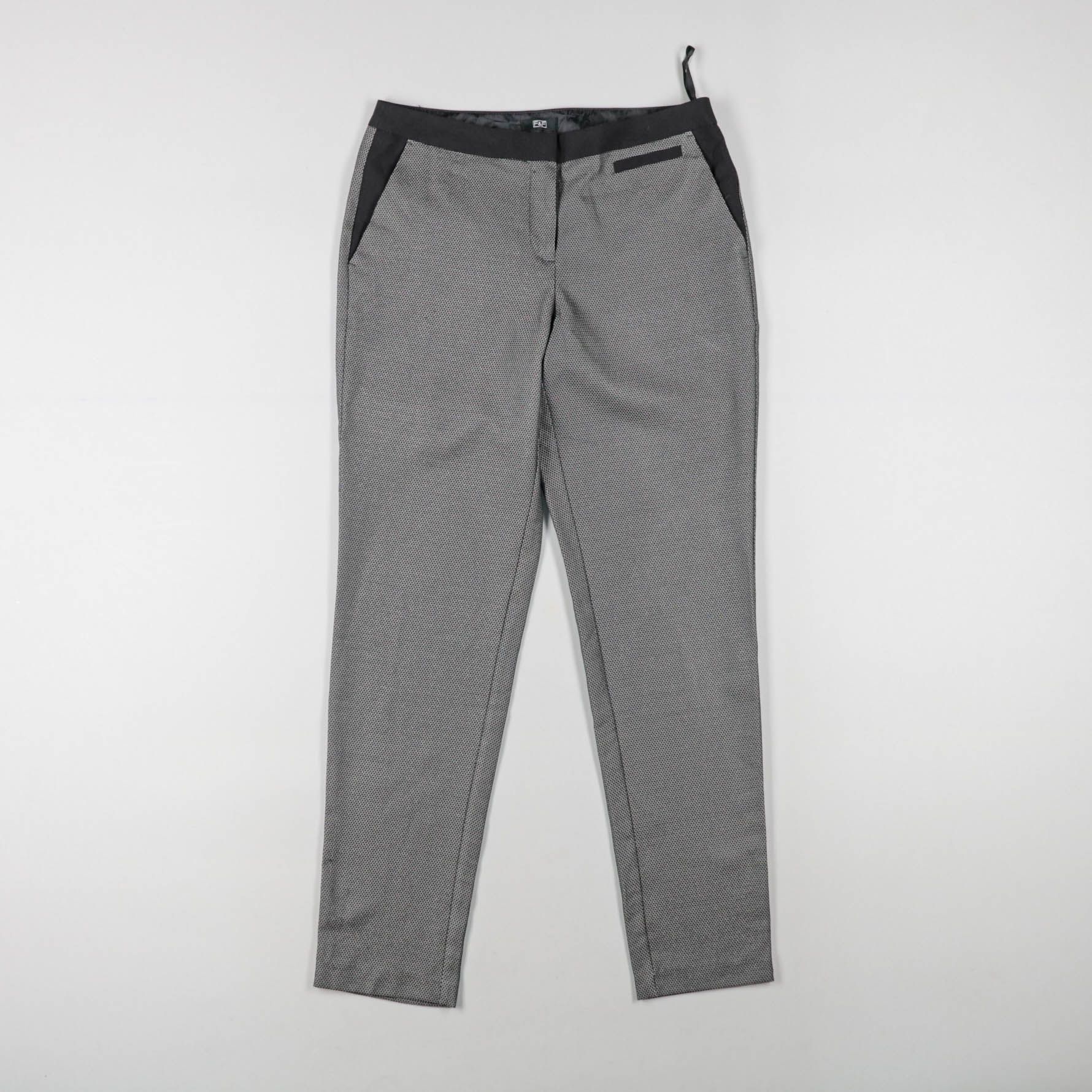 Женские брюки с мелким геометрическим узором в серо-чёрной гамме и контрастным чёрным поясом. Прямой зауженный крой подойдёт для офиса и повседневных образов с рубашкой или свитером. Практичны тем, что немаркий цвет и фактурная ткань хорошо держат форму.