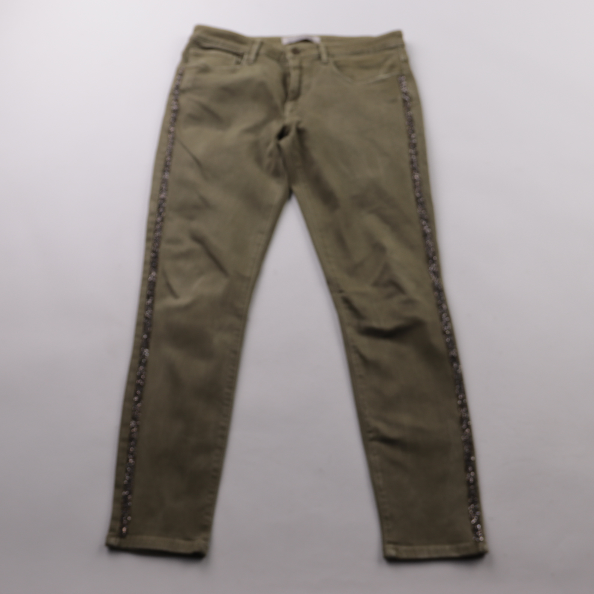 Женские брюки Zara Basic из денима цвета хаки, по боковым швам декоративная отделка. Подойдут для повседневных образов с футболками, свитерами и кедами/ботинками. Плотная ткань хорошо держит форму и удобна в носке.