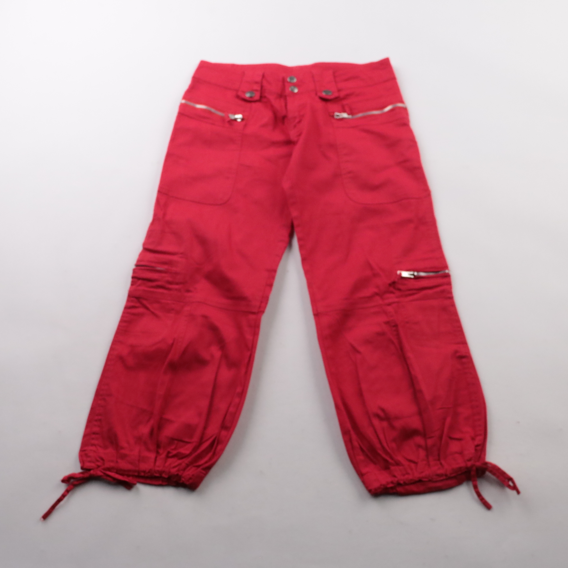 Женские брюки East Risen из хлопка с добавлением эластана, ярко‑красного цвета, с декоративными молниями и кулисками по низу. Подойдут для повседневных летних образов и прогулок; материал дышит и слегка тянется для более комфортной посадки.