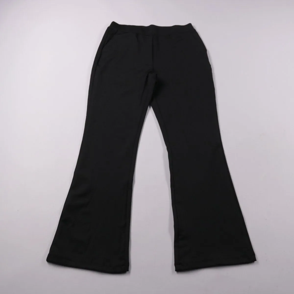 Черные женские брюки из эластичной ткани, слегка расклешенные к низу. Подойдут для повседневных и более строгих образов с обувью на каблуке или кедами. Практичный плюс — материал почти не мнется и комфортно тянется за счет спандекса.