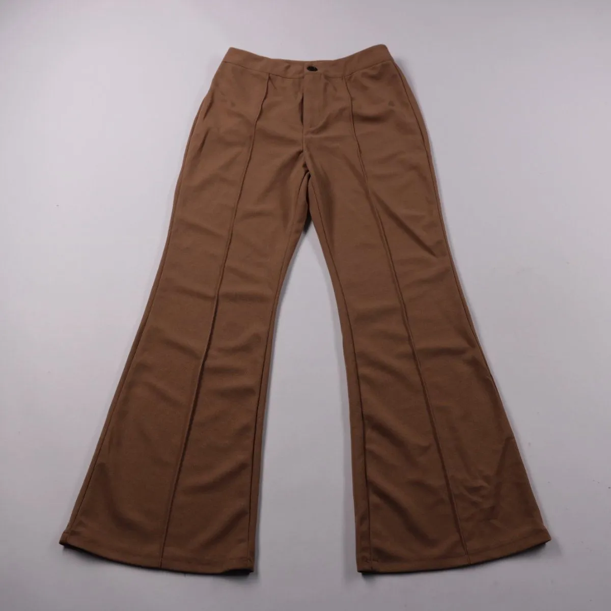 Женские брюки SHEIN коричневого цвета с расширением книзу и выраженными вертикальными швами спереди. Подойдут для повседневных и офисных образов с базовыми топами, рубашками и жакетами. Практичный плюс — визуально вытягивают силуэт за счёт кроя и линий швов.