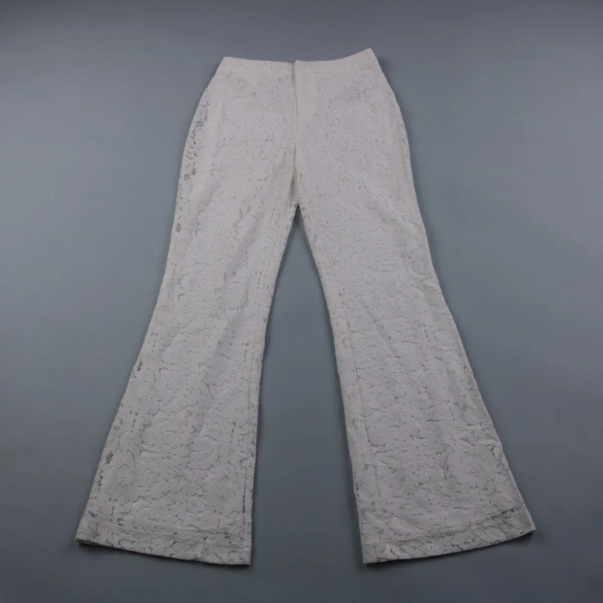 Женские белые брюки Gina Tricot из кружевного материала с подкладкой и расклешёнными штанинами. Подойдут для летних образов, отпуска и выходов, когда хочется добавить фактуры. Подкладка делает модель менее просвечивающей и комфортной в носке.