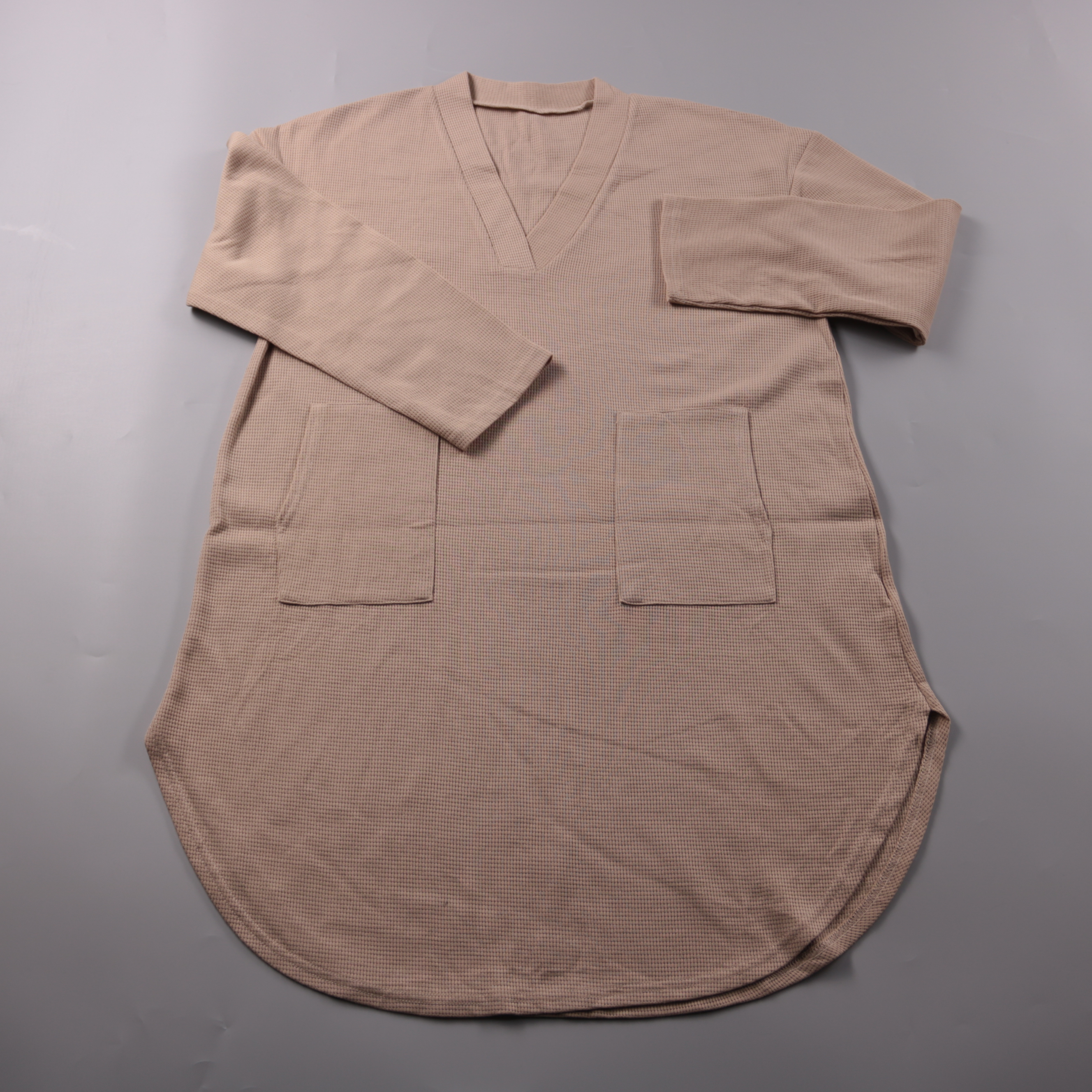 Платье Emery Rose бежевого цвета из фактурного трикотажа с V-образным вырезом и накладными карманами. Подойдёт для повседневных образов в прохладную погоду, удобно сочетать с кроссовками или ботинками. Практичный плюс — мягкая ткань и свободный крой, н...