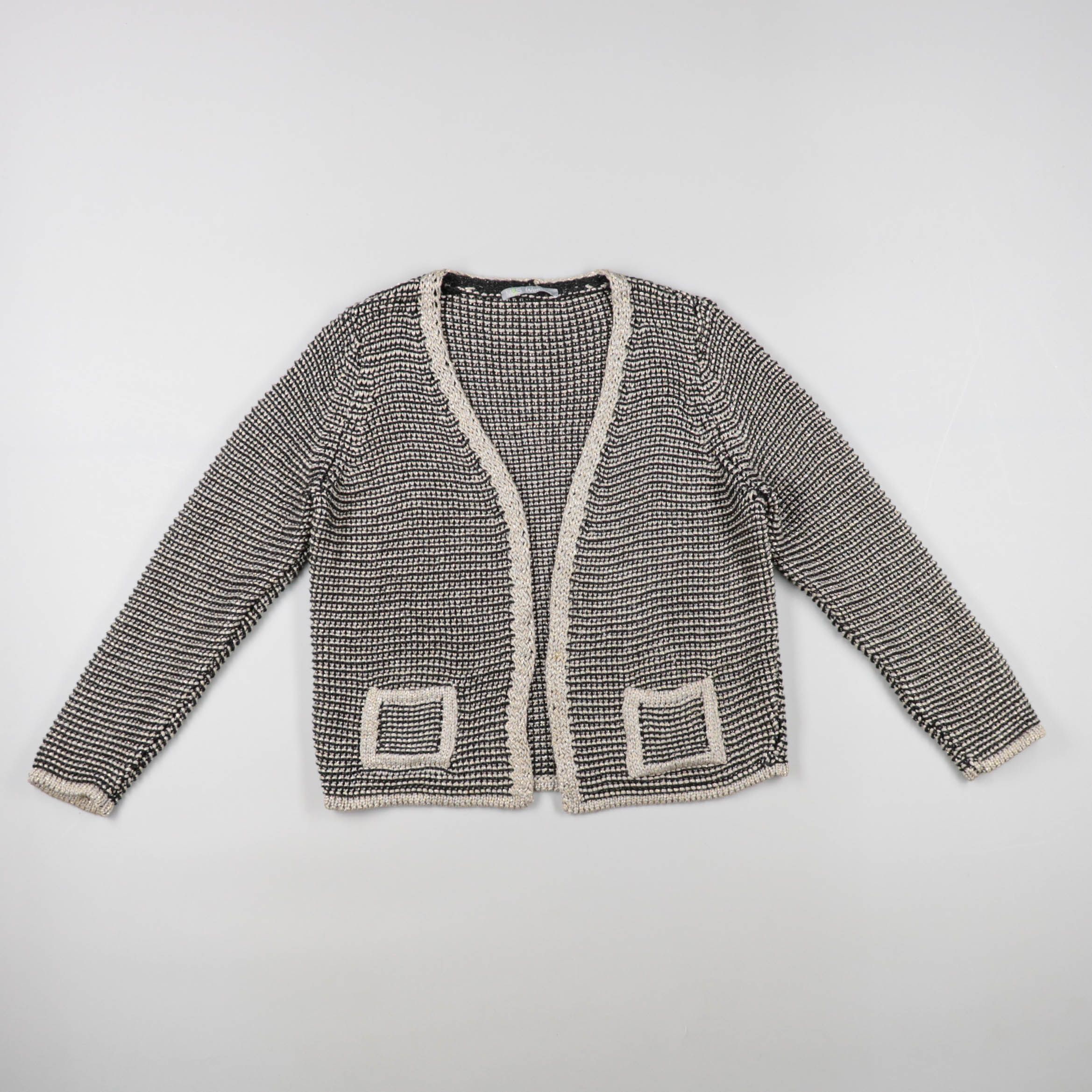 Вязаный кардиган с V-образным вырезом и контрастной светлой окантовкой, без застёжки, с накладными карманами спереди. Подойдёт для демисезона и прохладного лета: можно носить поверх топа, рубашки или платья. Практичен тем, что легко комбинируется с баз...