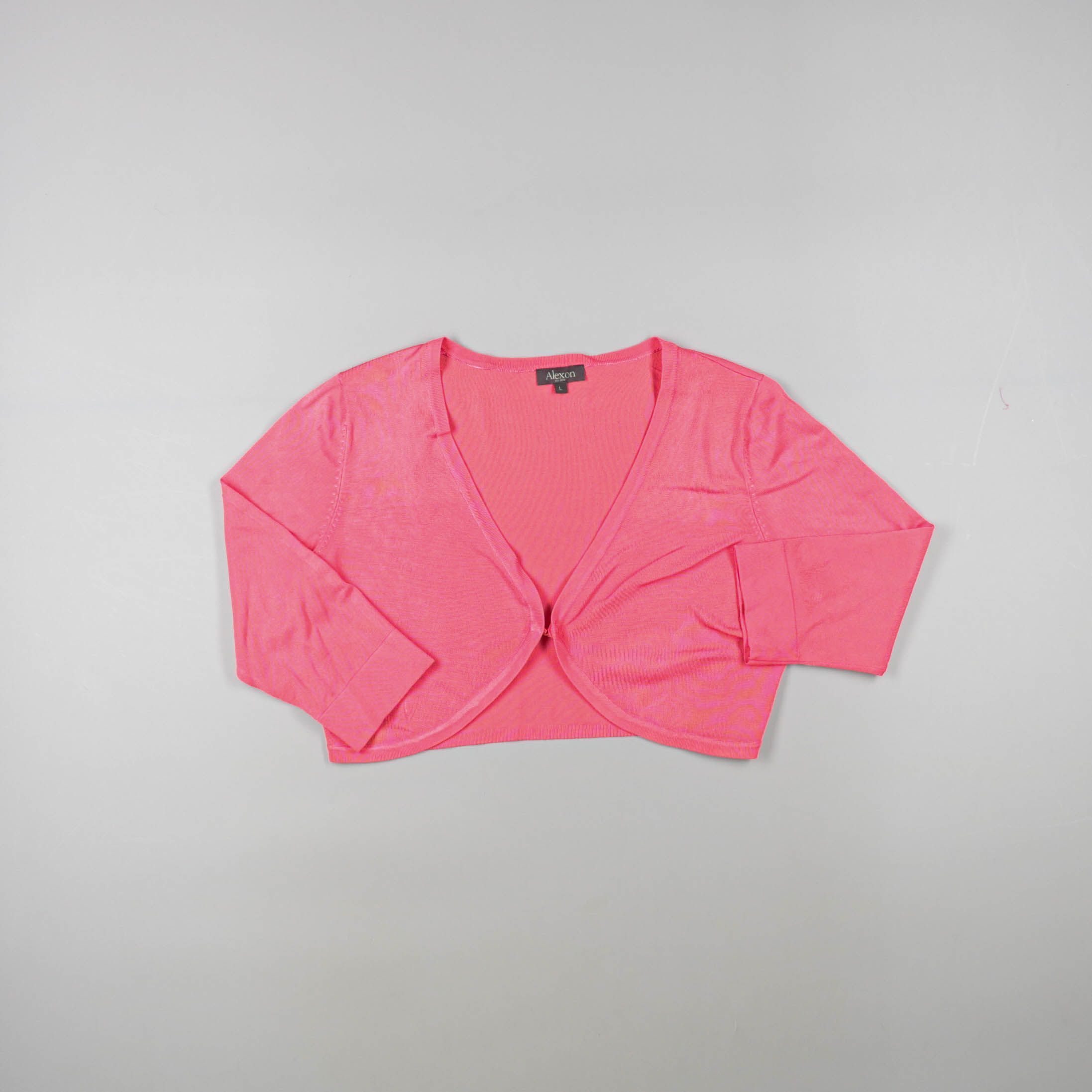 Укороченная кофта Alexon ярко-розового цвета с глубоким V-образным вырезом и застёжкой на одну пуговицу. Подойдёт для демисезона и летних вечеров, удобно накидывать поверх платья или топа. Лёгкий тонкий трикотаж не занимает много места и легко комбинир...