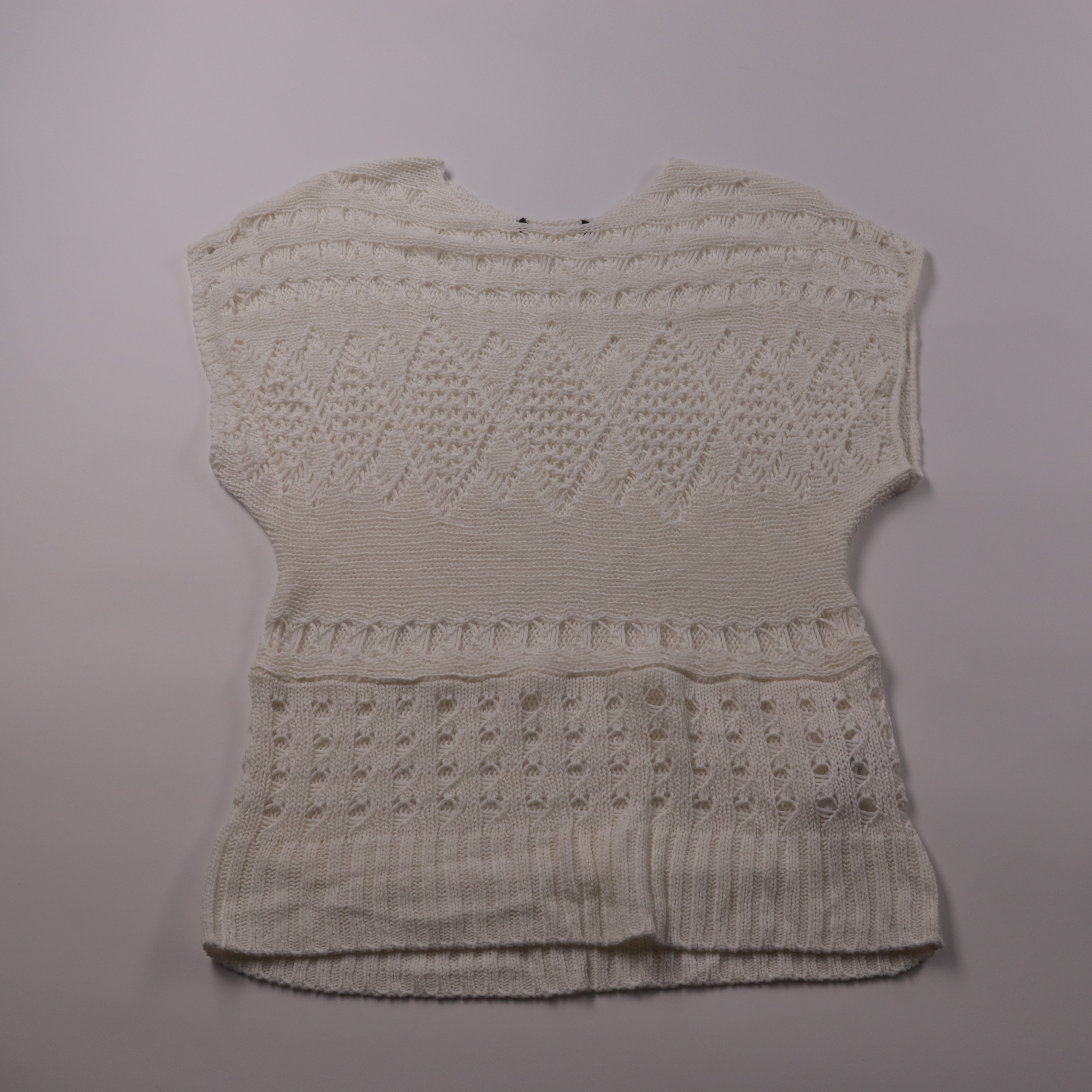 Вязаная кофта без рукавов молочного цвета с ажурным узором и V-образным вырезом. Подойдёт для лета и тёплой весны, хорошо смотрится с топом, рубашкой или платьем. Лёгкая и дышащая вязка, удобно носить как жилет в многослойных образах.