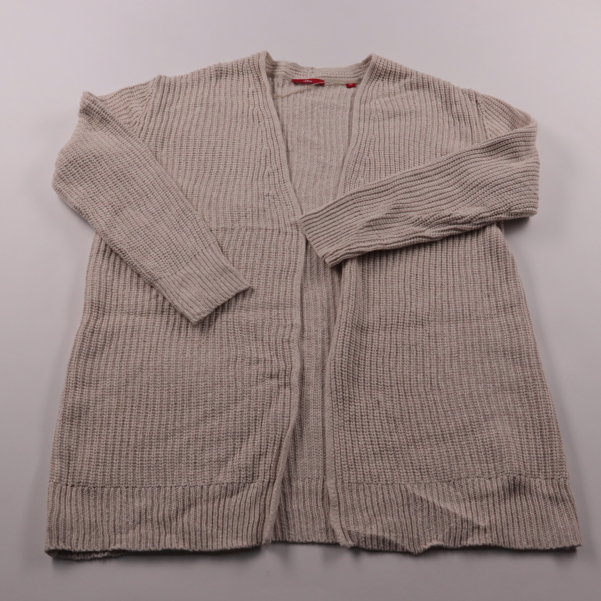 Вязаный кардиган S.Oliver бежевого цвета с фактурной вязкой и открытым передом без застёжки. Подойдёт для повседневных образов в прохладную погоду, хорошо сочетается с джинсами и платьями. Мягкая плотная вязка даёт дополнительное тепло и комфорт.