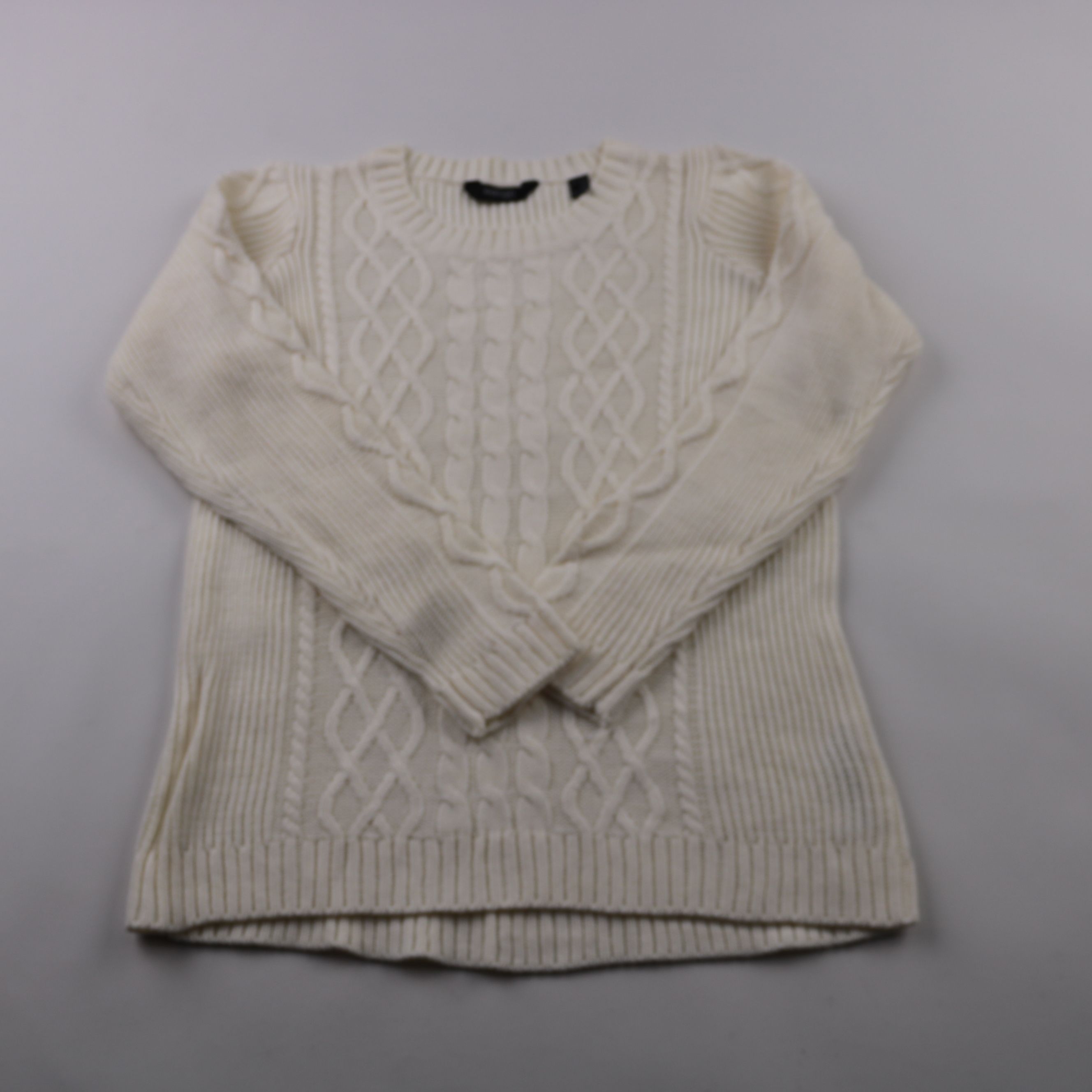 Вязаный свитер Tchibo молочного цвета с рельефным узором «косы» и круглым вырезом. Подойдёт для прохладной погоды и многослойных образов с джинсами или юбкой. Объёмная вязка хорошо удерживает тепло и выглядит фактурно.