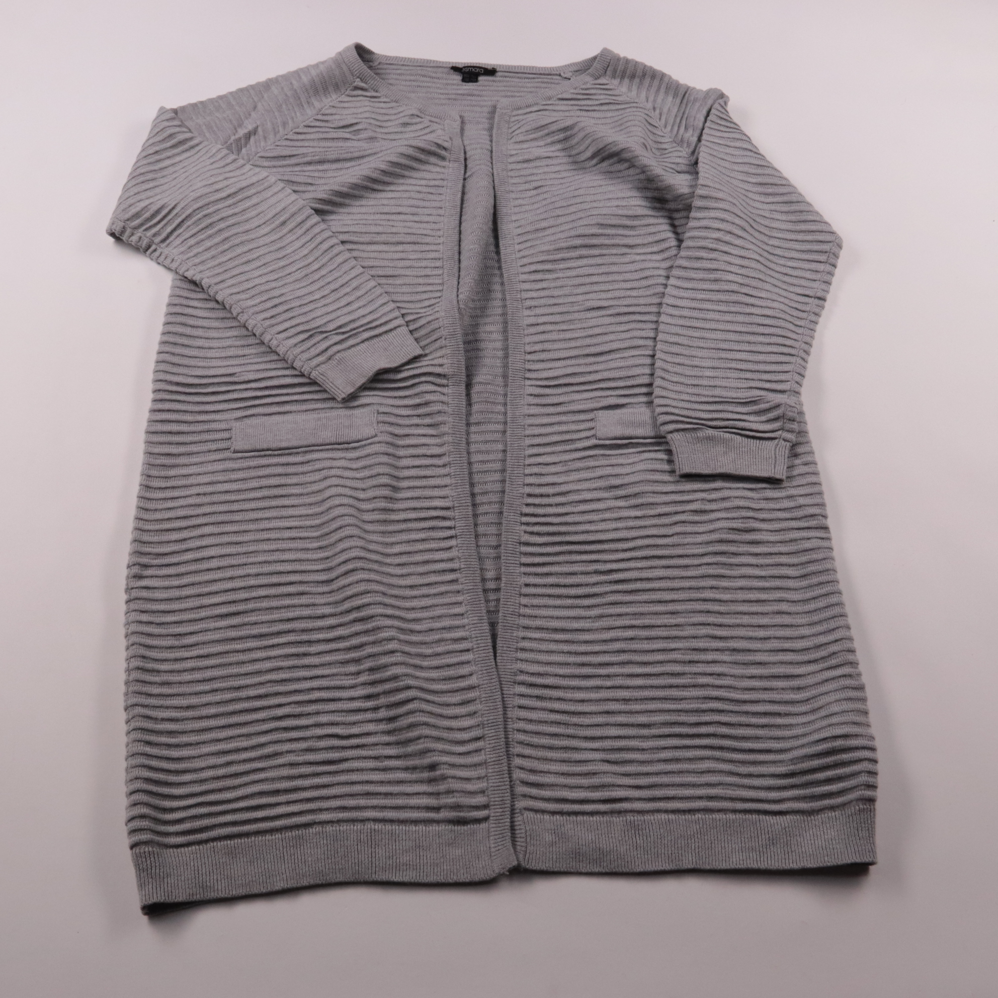 Вязаный кардиган Esmara серого цвета с фактурной резинкой, без застёжки и с накладными карманами. Подойдёт для офиса и повседневных образов в прохладную погоду, удобно носить как второй слой. Мягкий трикотаж не сковывает движения и легко сочетается с б...