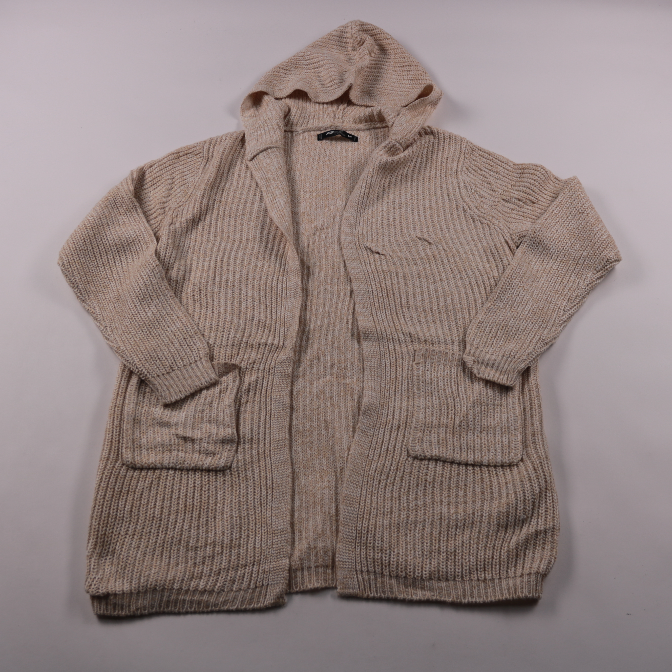 Вязаный кардиган FB Sister с капюшоном и накладными карманами, цвет бежевый. Подойдёт для повседневных образов в прохладную погоду: поверх футболки, водолазки или платья. Мягкий трикотаж и свободная посадка делают его удобным для многослойности.