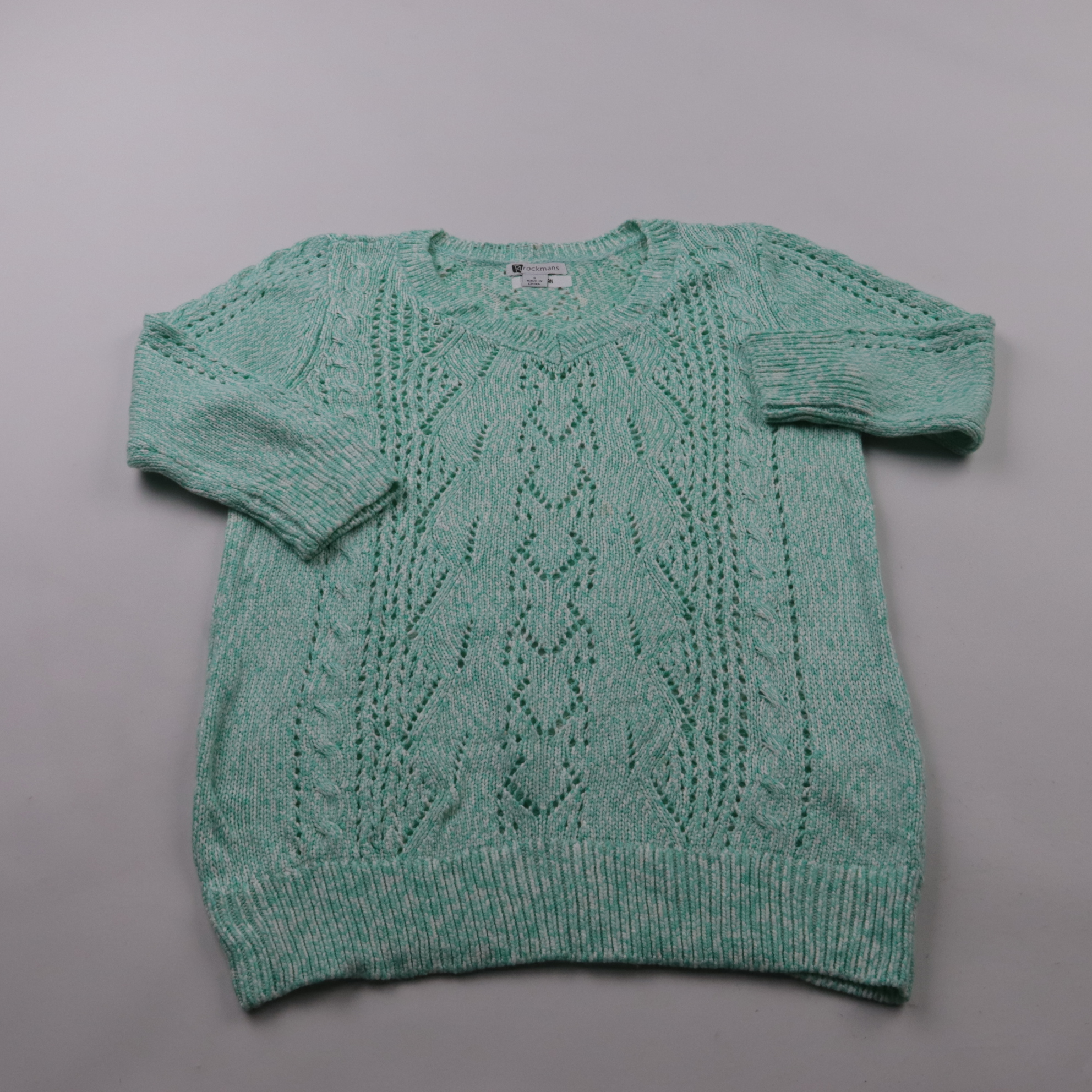 Вязаный джемпер Rockmans мятного цвета с ажурным узором и круглым вырезом. Подойдёт для повседневных образов в прохладную погоду, хорошо смотрится с джинсами и юбками. Акриловая пряжа лёгкая и быстро сохнет после стирки.