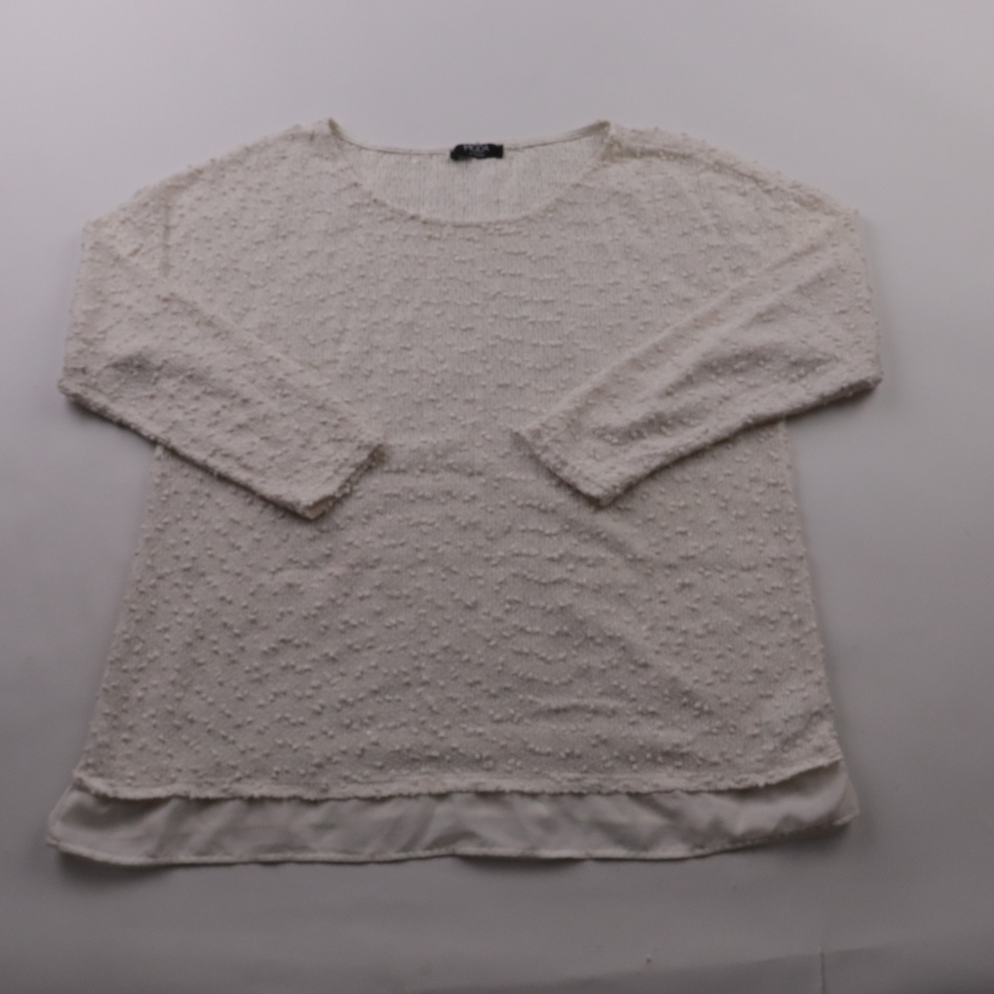 Кофта George кремового цвета с фактурной вязкой и круглым вырезом. Подойдёт для повседневных образов и офиса, легко сочетается с джинсами или юбкой. Практичный плюс — синтетический материал почти не мнётся и быстро сохнет.
